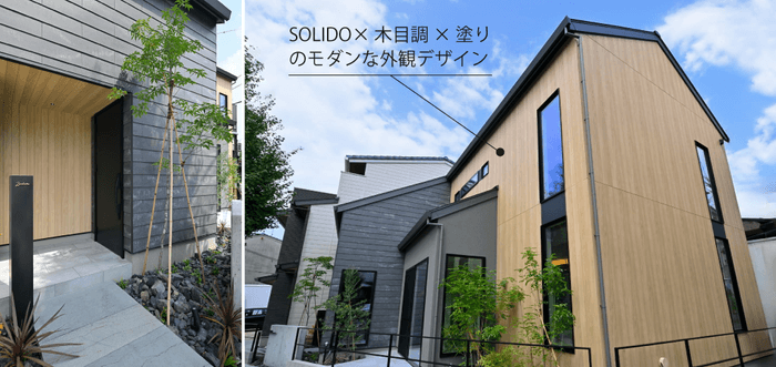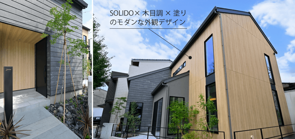 素材と色味で魅せる、シンプルかつ上質なファサードデザインは京都らしい和モダンな雰囲気。「SOLIDO(ストーン)×木目調×塗り」の素材MIXで無機質になりすぎず温もりも感じられるトレンドを取り入れたデザインです。スリット窓や縦長の窓が、光を柔らかく取り入れ、日々の暮らしに心地よさをプラス。京都の街並みに馴染みながらも、ふと目を引く“さりげない美しさ”を感じられます。