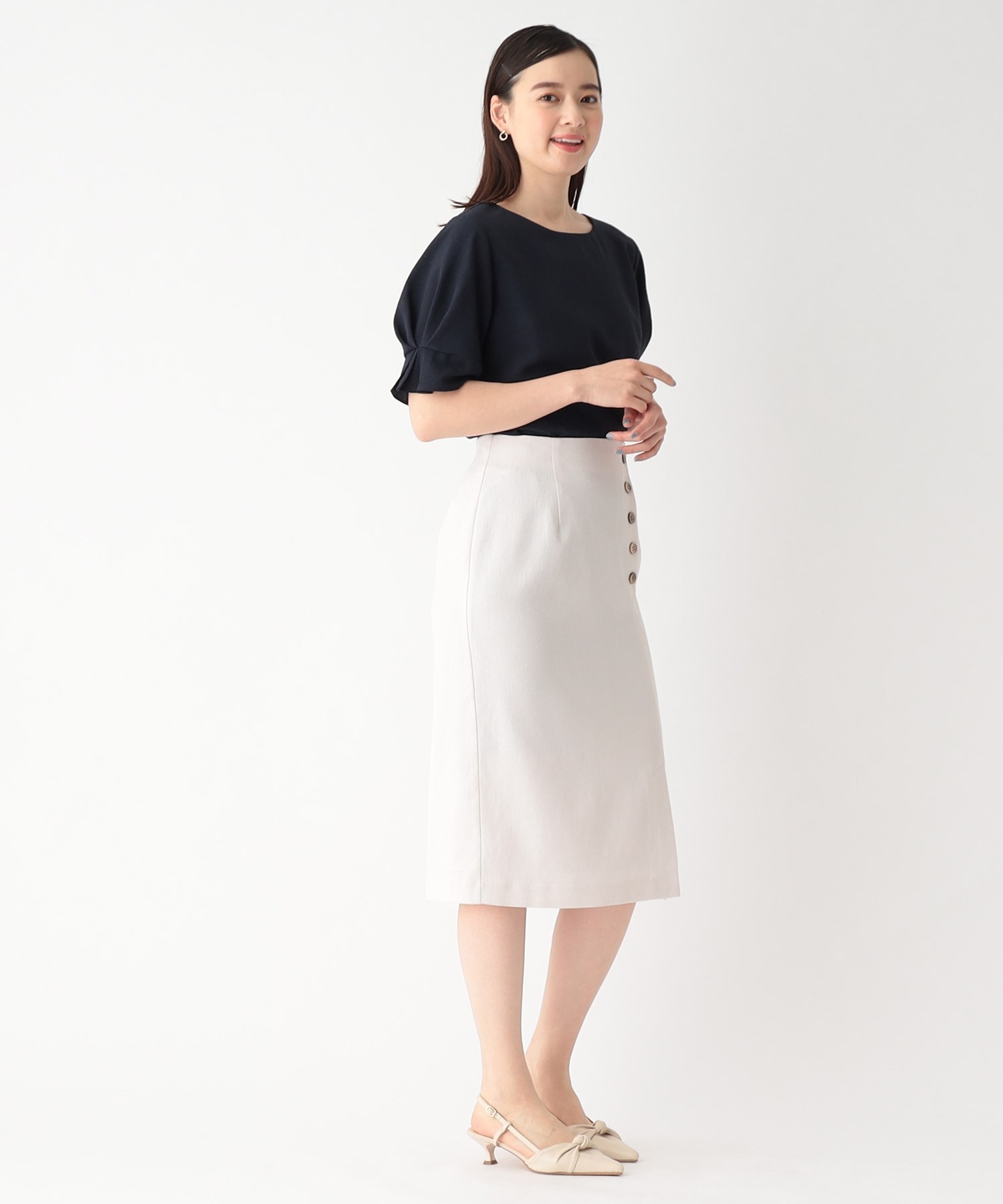二の腕を柔らかに包むパフスリーブは、袖口にあしらったタックが華やかな印象を与えてくれます。
