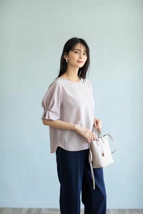発売から3シーズン目となる今年、累計販売数8万枚を突破した人気のタックスリーブブラウスは、これからの季節に向けて嬉しい機能付きの麻調合繊素材“タンブラーブッチャー”を使用した、オン・オフ共に活躍するアイテムです。