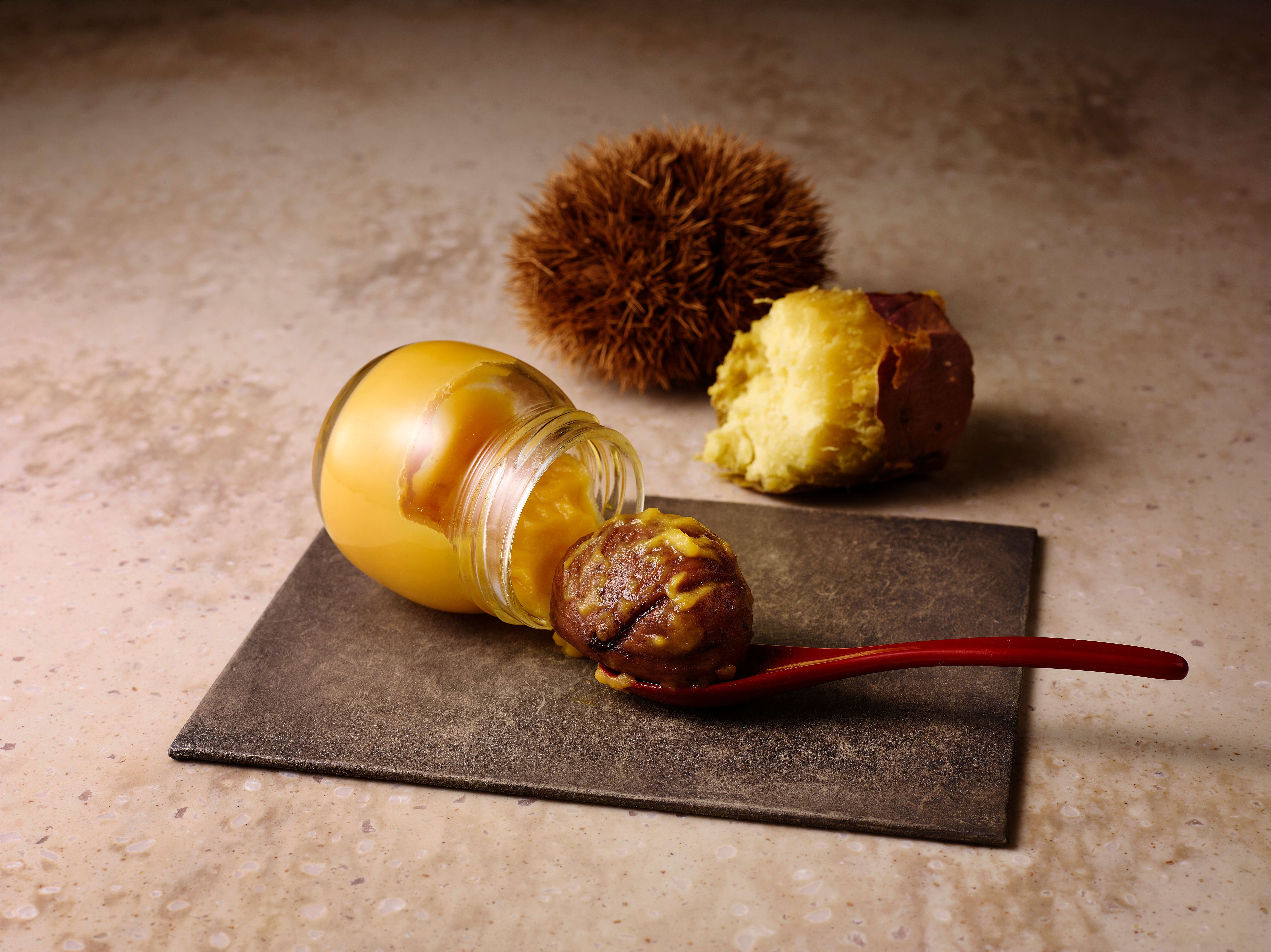 大粒の丹波栗が持つほっくりとした食感と、紅はるかの濃密な甘さが重なり合い、至福のひとときをお楽しみいただけます。