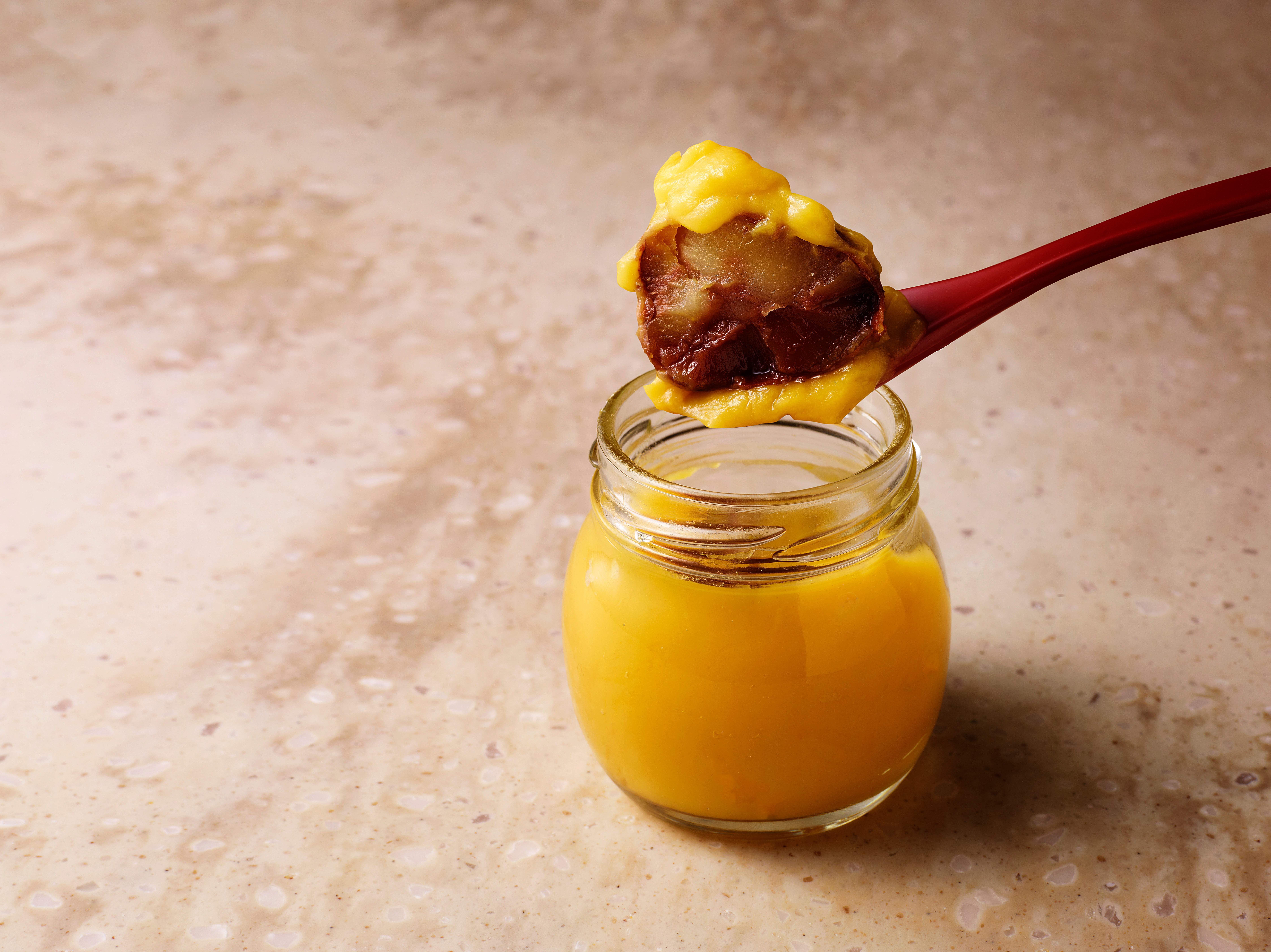 「まるごと丹波栗入り蜜芋プリン」には、丹波栗の甘露煮を一粒まるごと閉じ込めました。プリン部分には紅はるかをたっぷり使用し、蜜芋ならではの“ねっとり濃厚”な味わいを引き出しています。