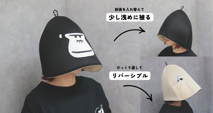 同シリーズの顔がすっぽり隠れてサウナに集中できる「瞑想サウナハット」が大ヒット商品だが、その形状のままゴリラのまもる顔をデザインしたら、まもるさんに変身できて面白いのでは?