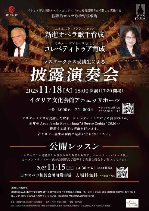 またマスタークラス受講生による披露演奏会を2025年11月18日(火)にイタリア文化会館アニェッリホールにて開催、公開レッスンを2025年11月15日(土)に日本オペラ振興会黒川稽古場にて開催いたします。