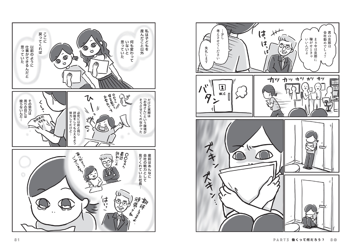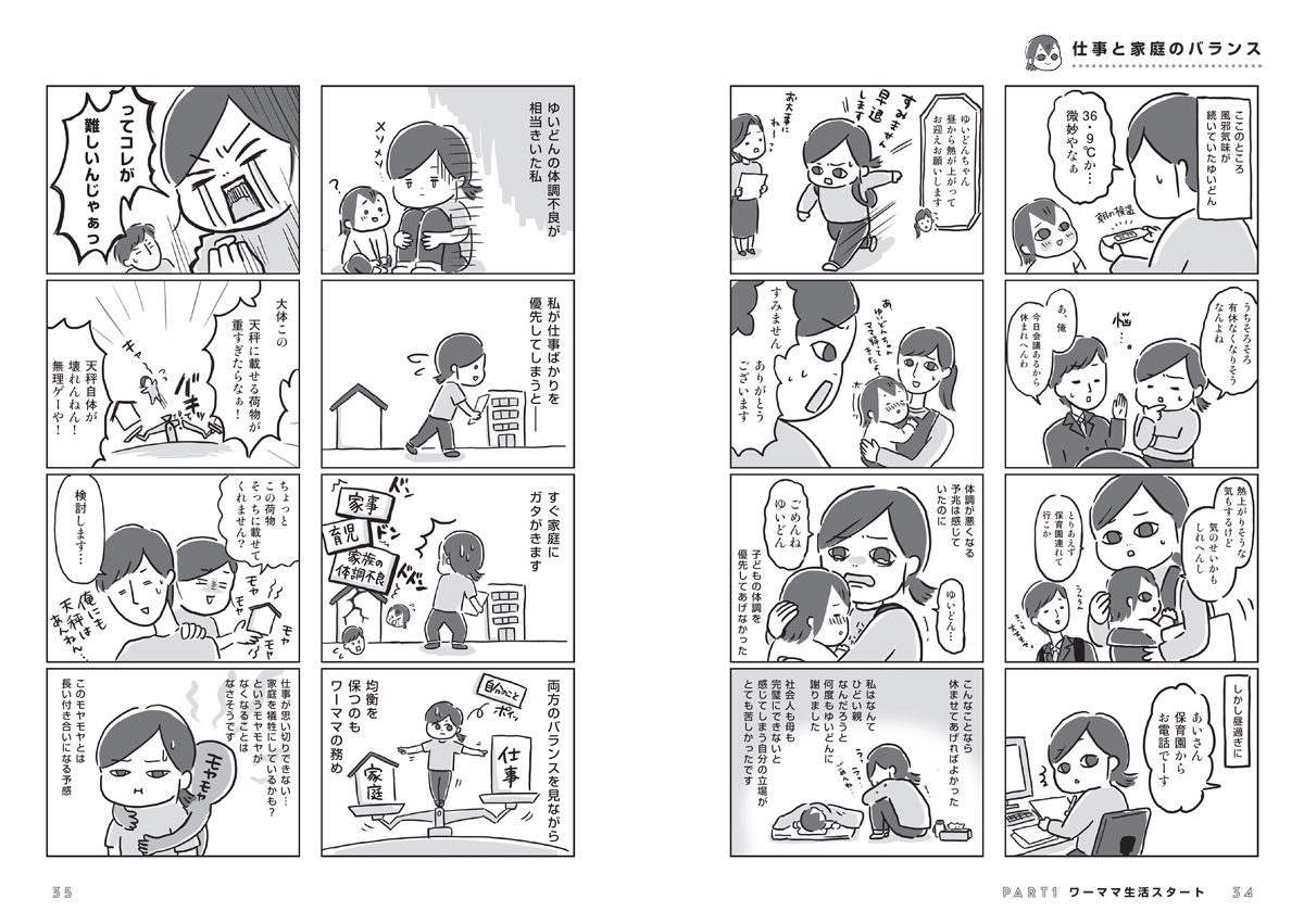 本書では、Instagram(インスタグラム、以下 インスタ)で育児漫画が大人気(フォロワー6.8万人[2020年10月現在])の著者「あい」さんにより、多くのワーママたちが経験する働きながらの出産経験や職場復帰直後の数か月間のエピソードが独特のタッチで描かれています。また、インスタでも人気の長女・ゆいどんのかわいいエピソードはもちろんのこと、時短勤務で思うように働けないもどかしさや、共働き育児をめぐっての夫との「わかってない!」バトルなど、ワーママたちが「ある!ある!」と思わずうなずいてしまうエピソードが満載です。さらに、本書では、マイナビ出版が運営するWEBサイト「くらしの本棚」( https://book.mynavi.jp/kurashi/ )の連載に加えて80ページ以上を描き下ろして収録しており、本書でしか読めない内容となっています。