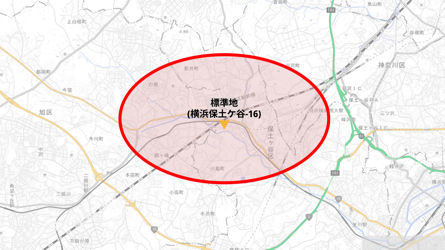 今回は、標準地(横浜保土ケ谷-14)周辺の下記エリア内のマンション事例①(築10年~19年)、マンション事例②(築20年~29年)、マンション事例③(築30年~45年)を対象に、過去5年の一般市場価格を抽出します。