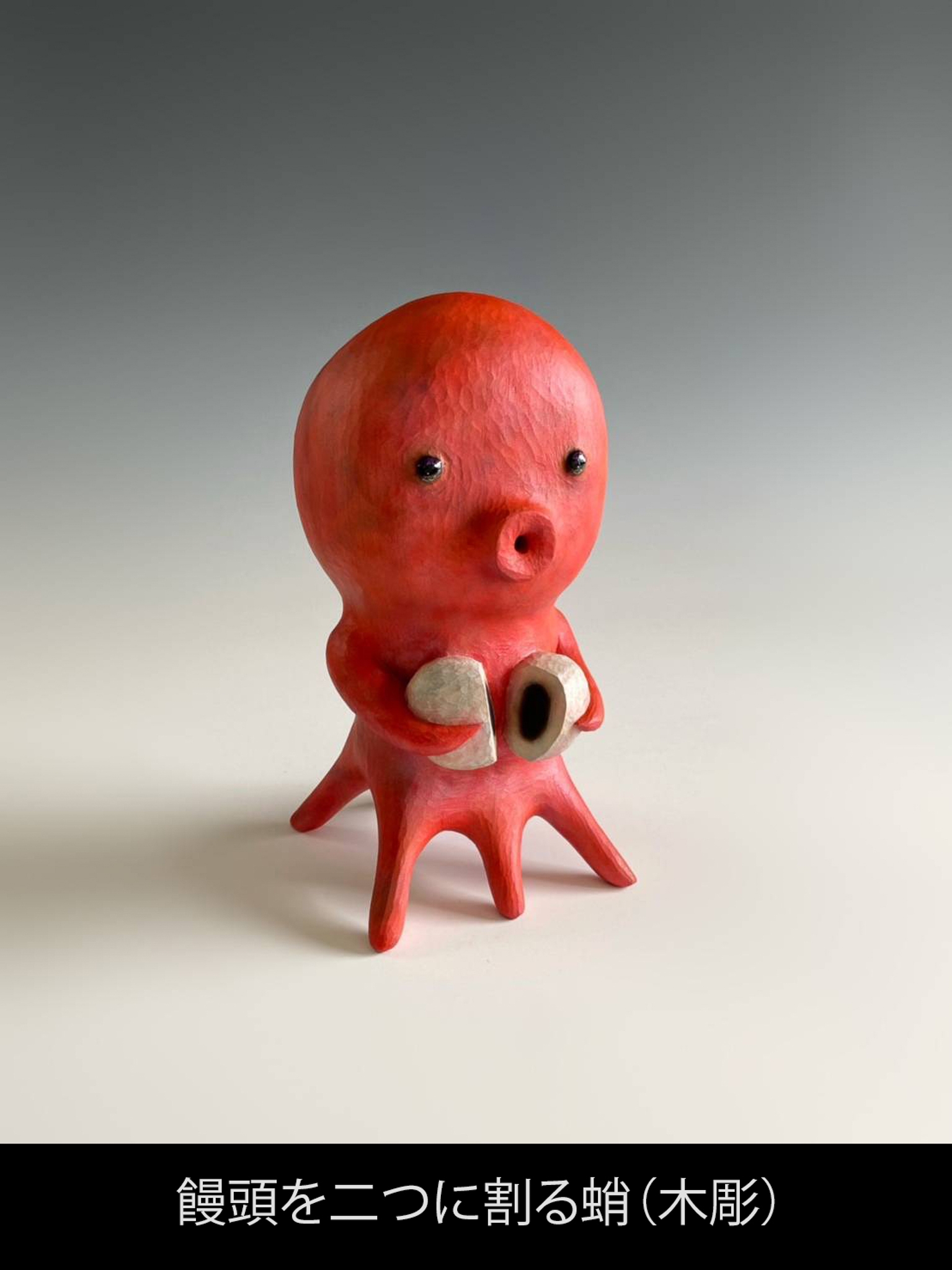 ・饅頭を二つに割る蛸(木彫)