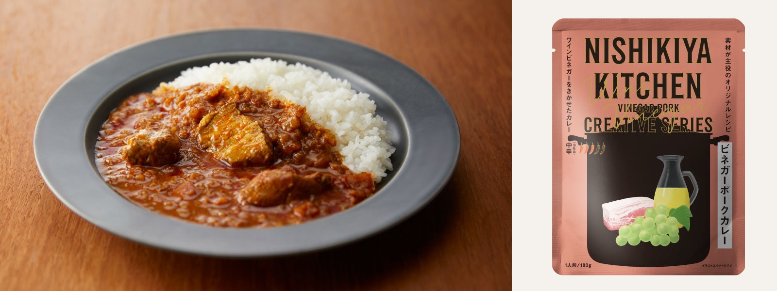 ニシキヤキッチンのインドカレーシリーズにもポークビンダルがありますが、「ビネガーポークカレー」はその味わいをお手本にしながらも、スパイスは控えめで誰もがおいしく食べられる味わいを目指しました。