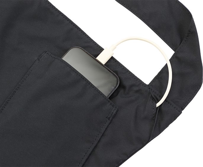 ショルダー表面にはスマートフォン用のポケットが付いており、いつでもサッと取り出しが可能です。