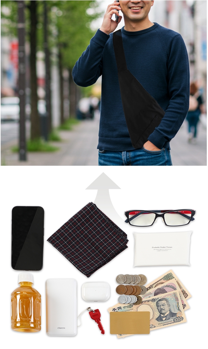 ポケットの付いたショルダーを着ることによって、必要なものを身につけ、常に持ち歩くためのアイテムです。