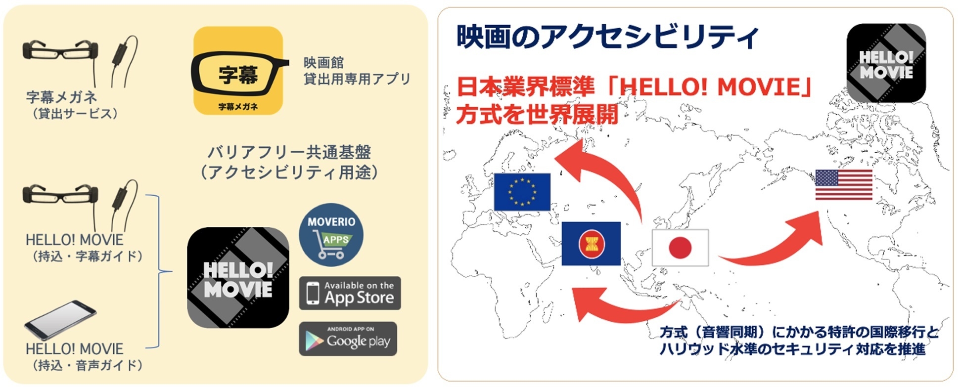 今後はこれまでにコンテンツビジネスで培った海外ネットワークを活用し、米国ハリウッドスタジオや、欧州、APACの映画関連事業者に「HELLO! MOVIE方式」を活用してもらうよう働きかけ、映画館向けソリューションベンダーとして、国内および海外のバリアフリー上映のマーケットの拡大に貢献していく考えです。なお、Warner Bros. JapanとSony Pictures Entertainment Japanの日本国内製作作品については、すでに「HELLO! MOVIE」ならびに「字幕メガネ」が採用されています。