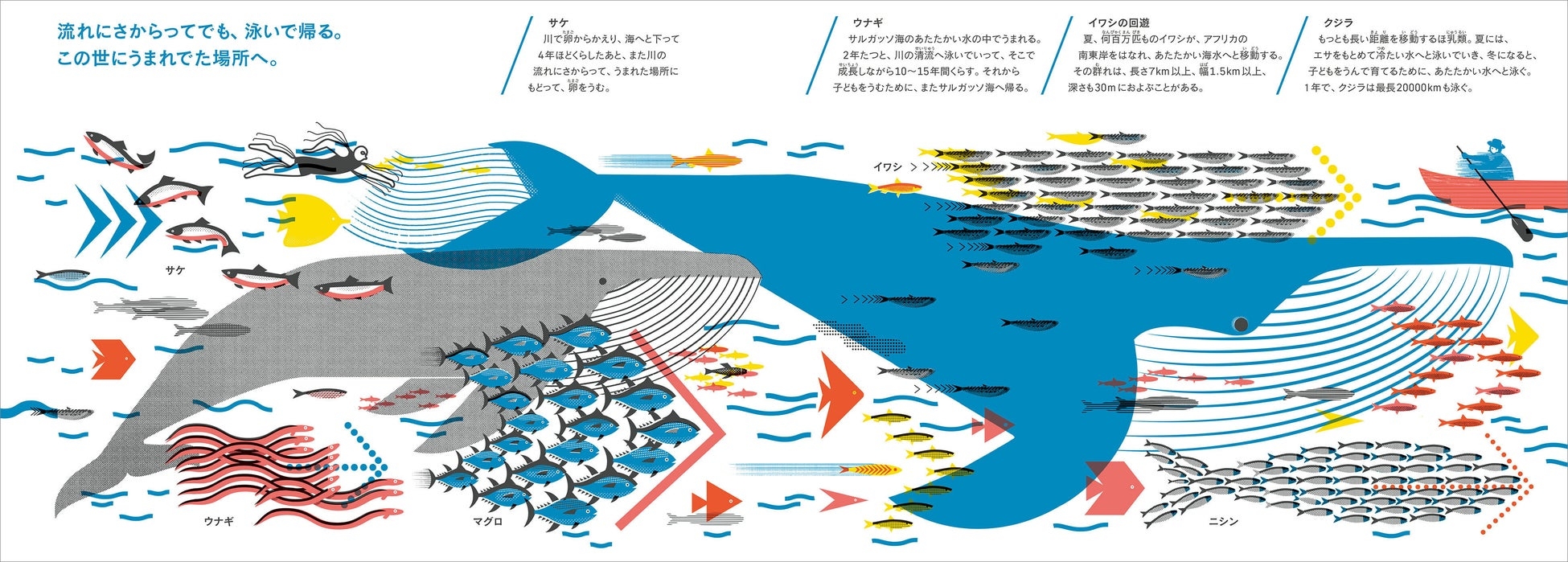 たしたちは進化の過程による移動の歴史や、乗りものの発明による移動手段の変化、探検、戦争、避難、巡礼、観光…さまざまな目的によって、海底から山のてっぺん、空から宇宙まで、時に迷い、方向転換をし、歩んできた。風や水は自由に境界を越え、動物たちは地図もコンパスもなしに移動する。動くことにより、あたらしい世界をひらいてきたわたしたちの物語。