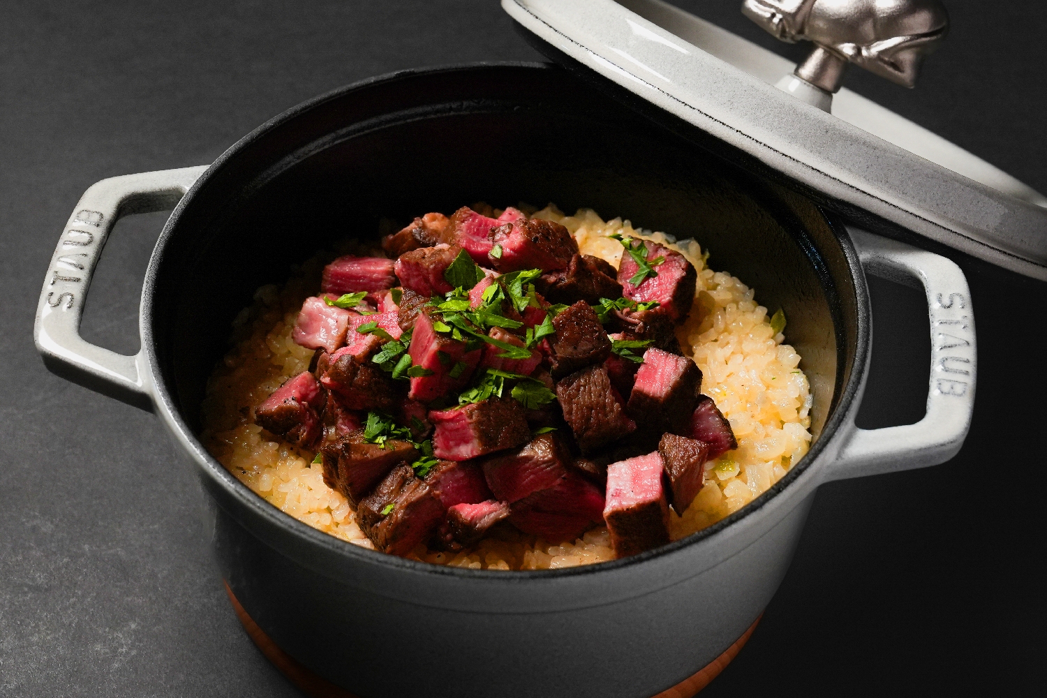 ブイヨンで炊き上げたご飯にバターとガーリックを混ぜ込み、その上にたっぷりのヒレ肉がゴロゴロと乗った、ボリューム満点で複数人で取り分けできる食べ応えのある一品です。仕込みにも職人のこだわりとお時間を要する「牛ヒレごはん」は、事前予約が必須です。事前予約いただければランチタイムでもご提供が可能です。