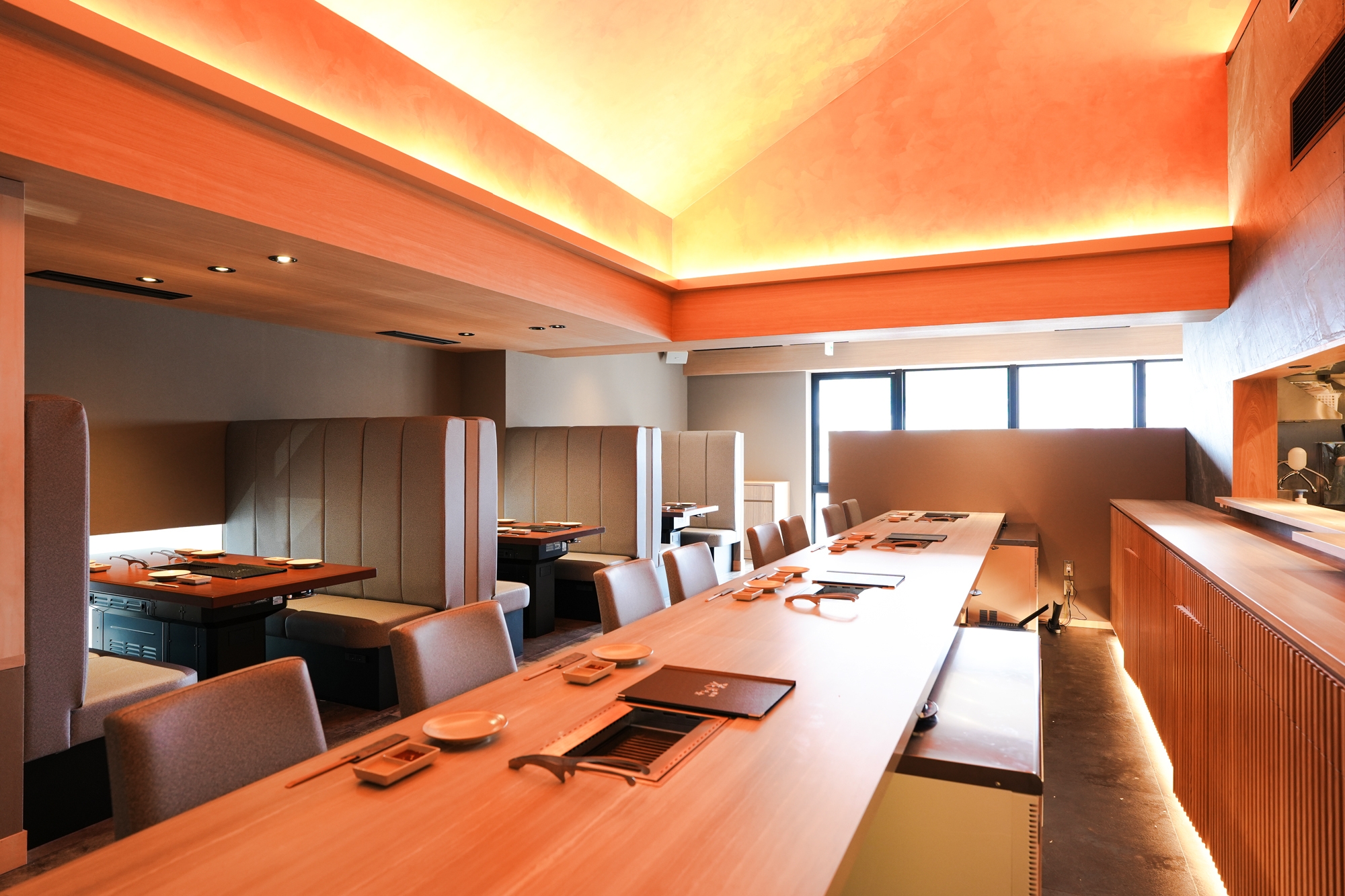 店内に入ると吹き抜けのシックで落ち着いた空間が目の前に広がり、スタッフと対面式のカウンター席の前にはこだわりのオープンキッチンがお目見え。名物「野原焼」や「和牛の握り」をスタッフが対面から焼き、ライブ感のあるお食事をお楽しみいただけます。
