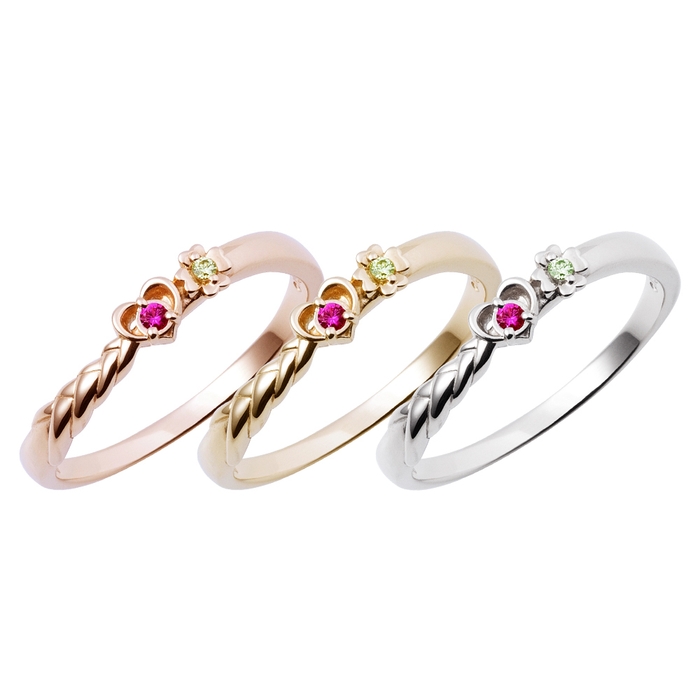 細身のウェーブタイプのリングにイメージカラーストーンをセットし、髪飾りをデザインに取り込んだシンプルで普段使いのしやすいデザインです。