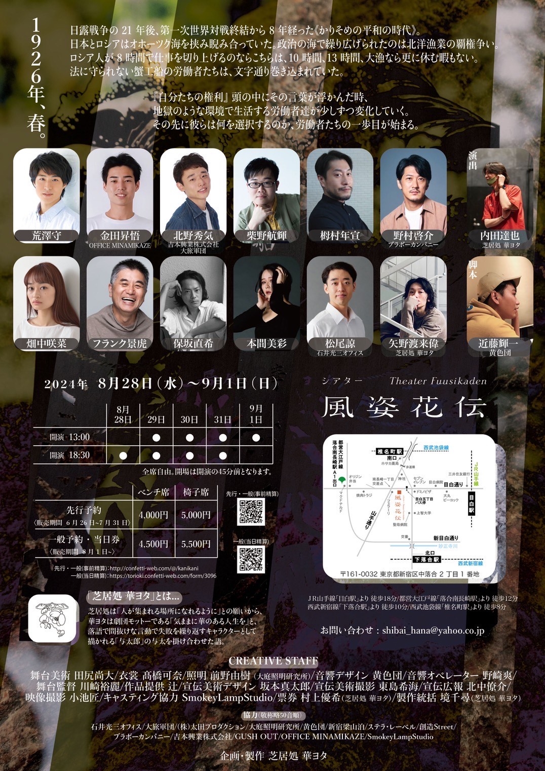 芝居処 華ヨタ(主宰:内田)主催、『娯楽版 蟹工船 立つる波』が2024年8月28日 (水) 〜 2024年9月1日 (日)にシアター風姿花伝(東京都 新宿区 中落合 2-1-10)にて上演されます。