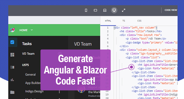 デザインされたものはすべて、プロダクションレベルでAngularとBlazorに対応した(ReactとWeb Componentsは近日対応予定)HTML、TypeScript、CSSを生成します。また、開発者は作成中のコードをリアルタイムで確認することができます。準備ができたら、GitHubリポジトリにアップロードしたり、アプリケーションのZIPファイルをダウンロードして、Visual Studioや好みのIDEで使用することができます。