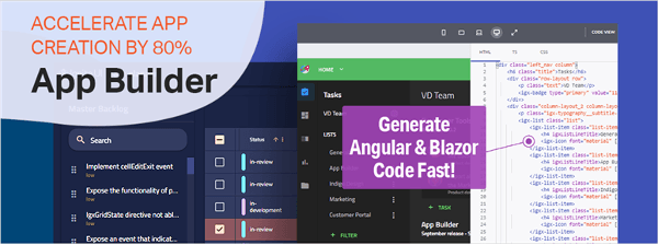 - AngularおよびBlazorにおけるデザインからコード作成までの時間を短縮し、プロダクション環境で利用可能なコードを出力する、ローコードのApp Builder(R)で開発者の生産性を向上
