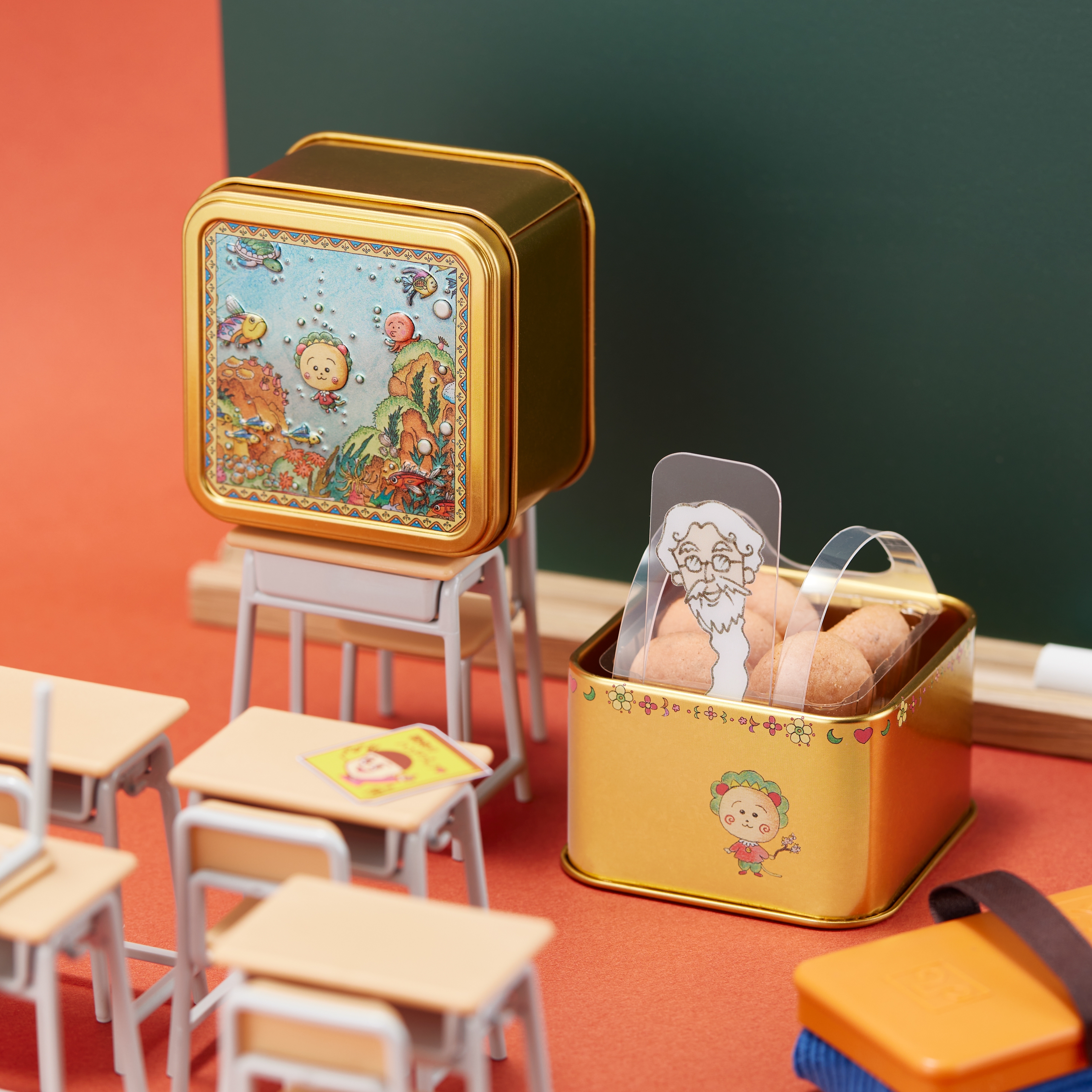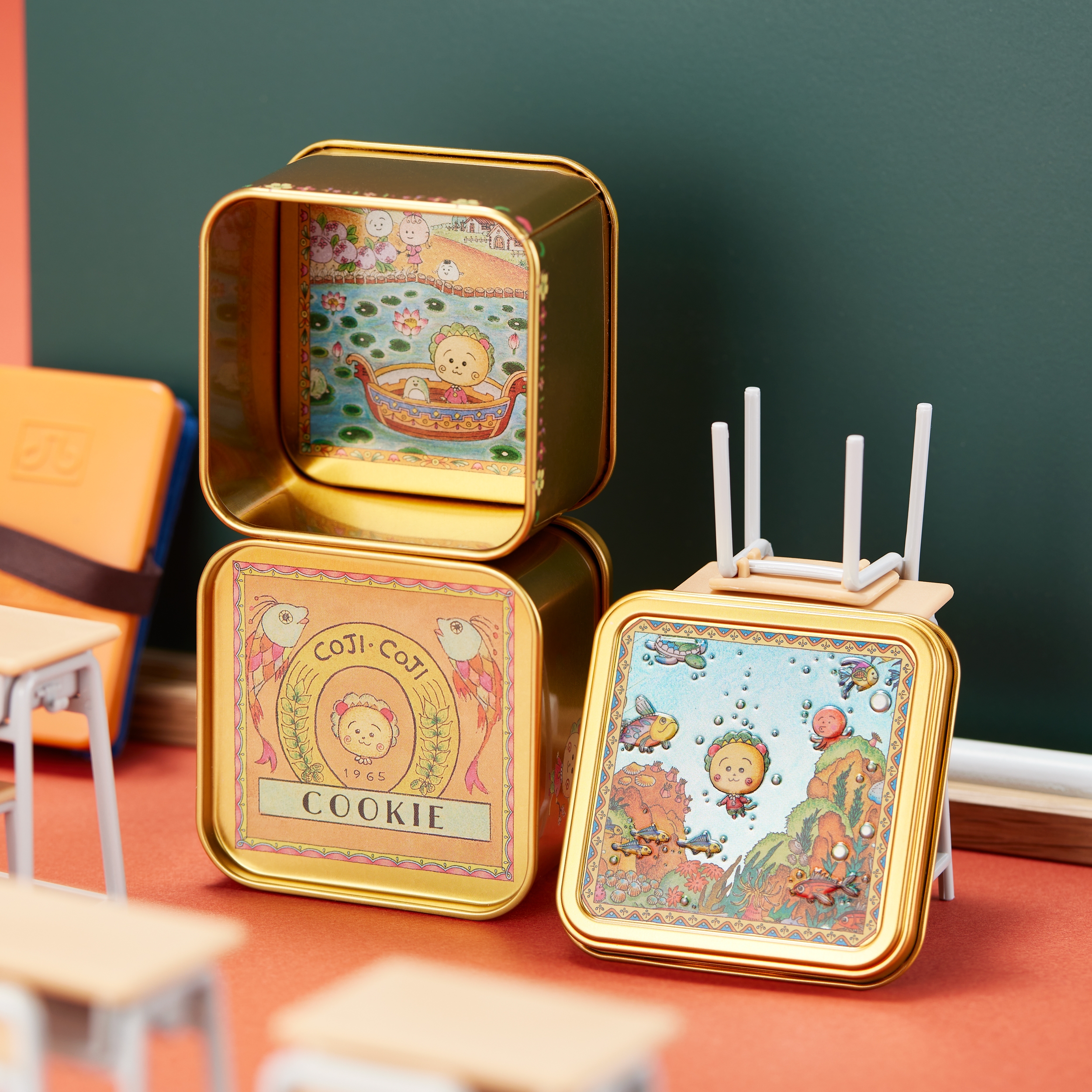 キラキラ輝くコジコジ缶。缶の蓋面のみならず、缶の底面、裏面にもコジコジの扉絵がデザインされています。缶を開けると「物知りじいさん」が登場。グルテンフリー&植物素材で作ったさくら風味のクッキーが入っています。