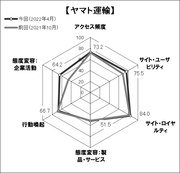 「ヤマト運輸」は、一般企業サイト内順位が前回第6位から第1位に上昇。500サイトでの全体順位は第7位となった。WBIは前回のスコアから6.7ポイント増の78.3ポイントだった(図表2)。個別の指標では、今回、サイトを通じた企業活動に対する「理解」「関心」などの意識変化を測る「態度変容:企業活動」のスコアが上昇し、WBIを押し上げた(図表3)。また、「サイト・ロイヤルティ」が84.0ポイントで、一般企業サイト内で第1位の評価を獲得した。自由意見では、荷物の追跡サービスや再配達依頼などへの言及が多く、インターネット通販での宅配便の利用機会増加などを背景に、「信頼できる」「役に立つ」サイトとして高評価を得ている。
