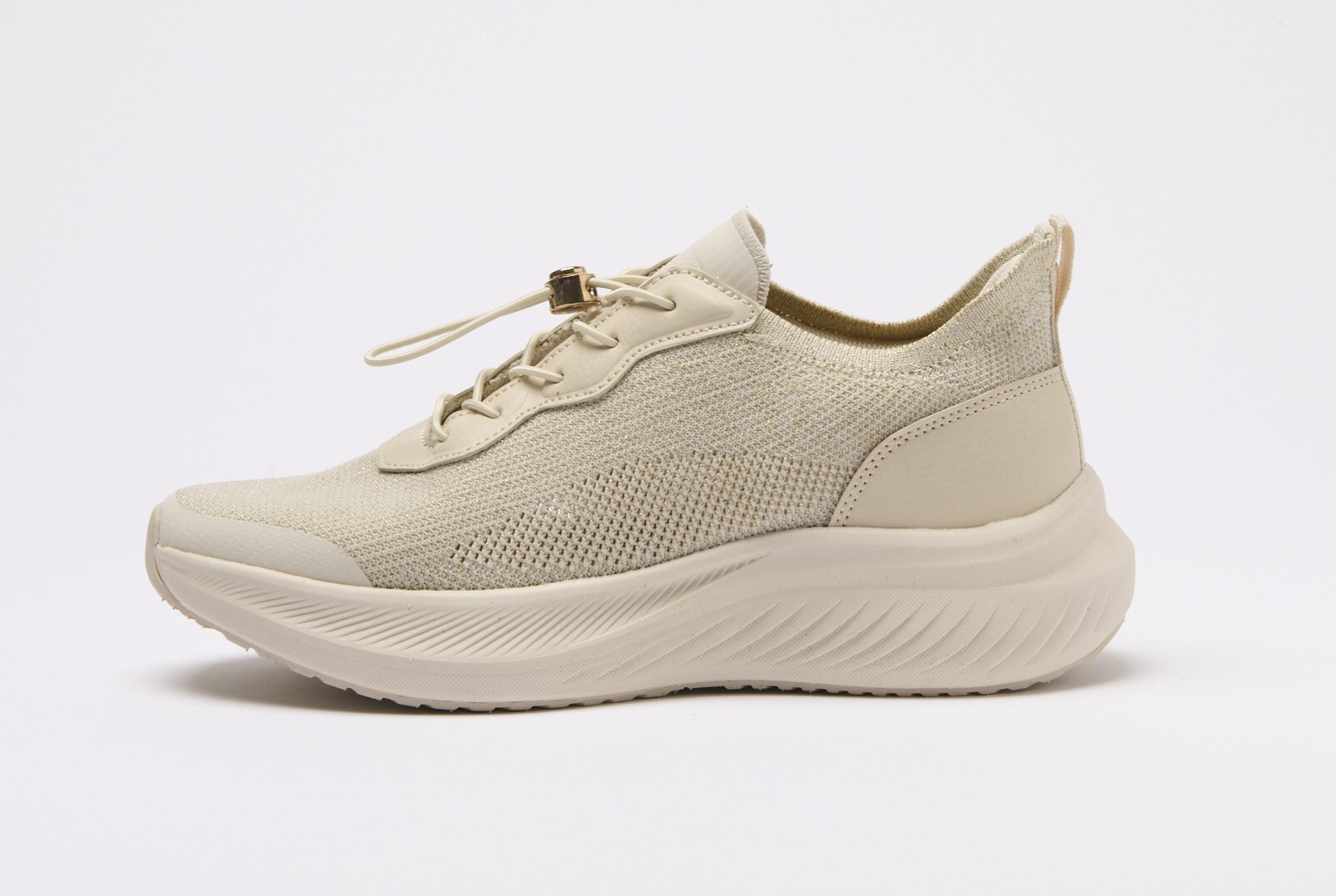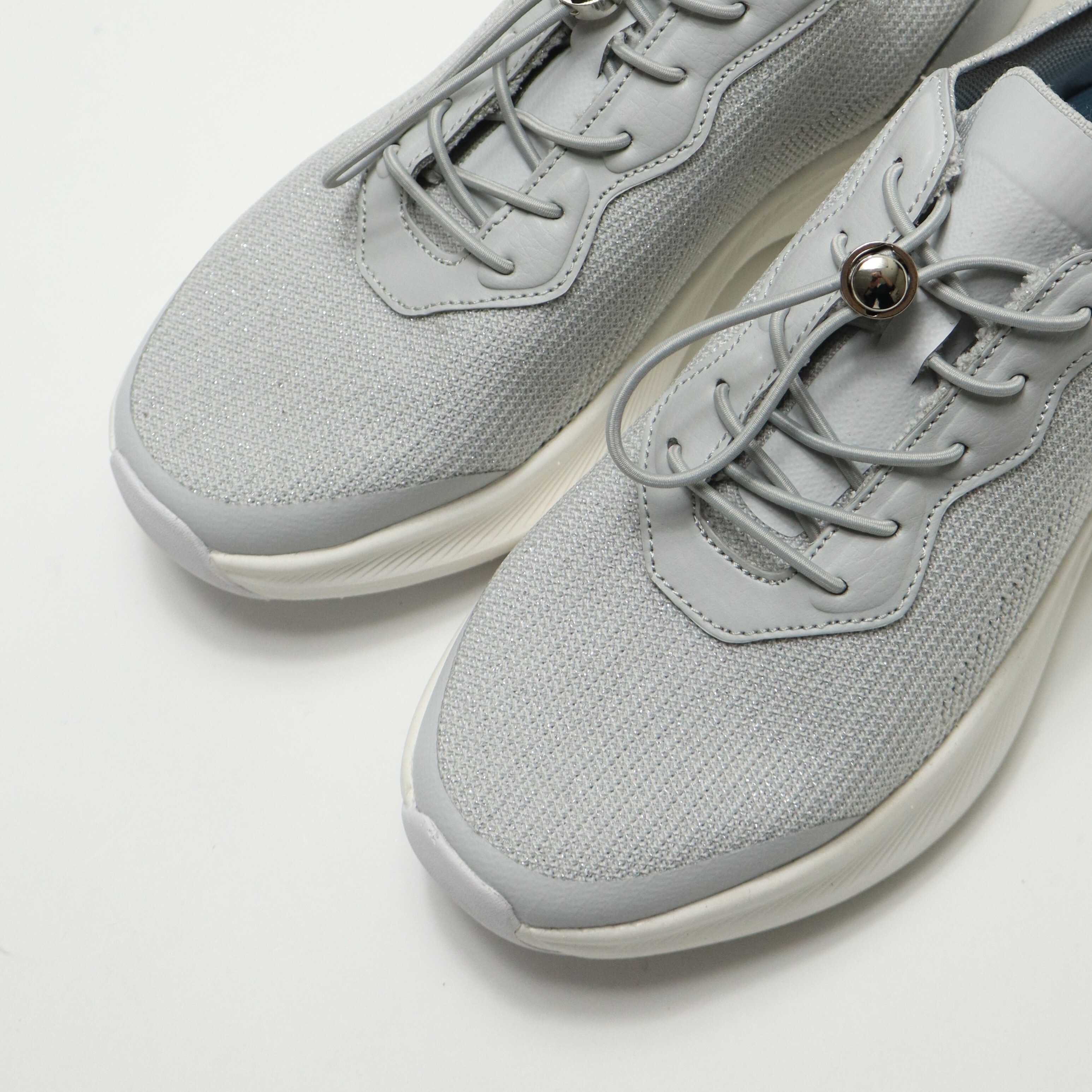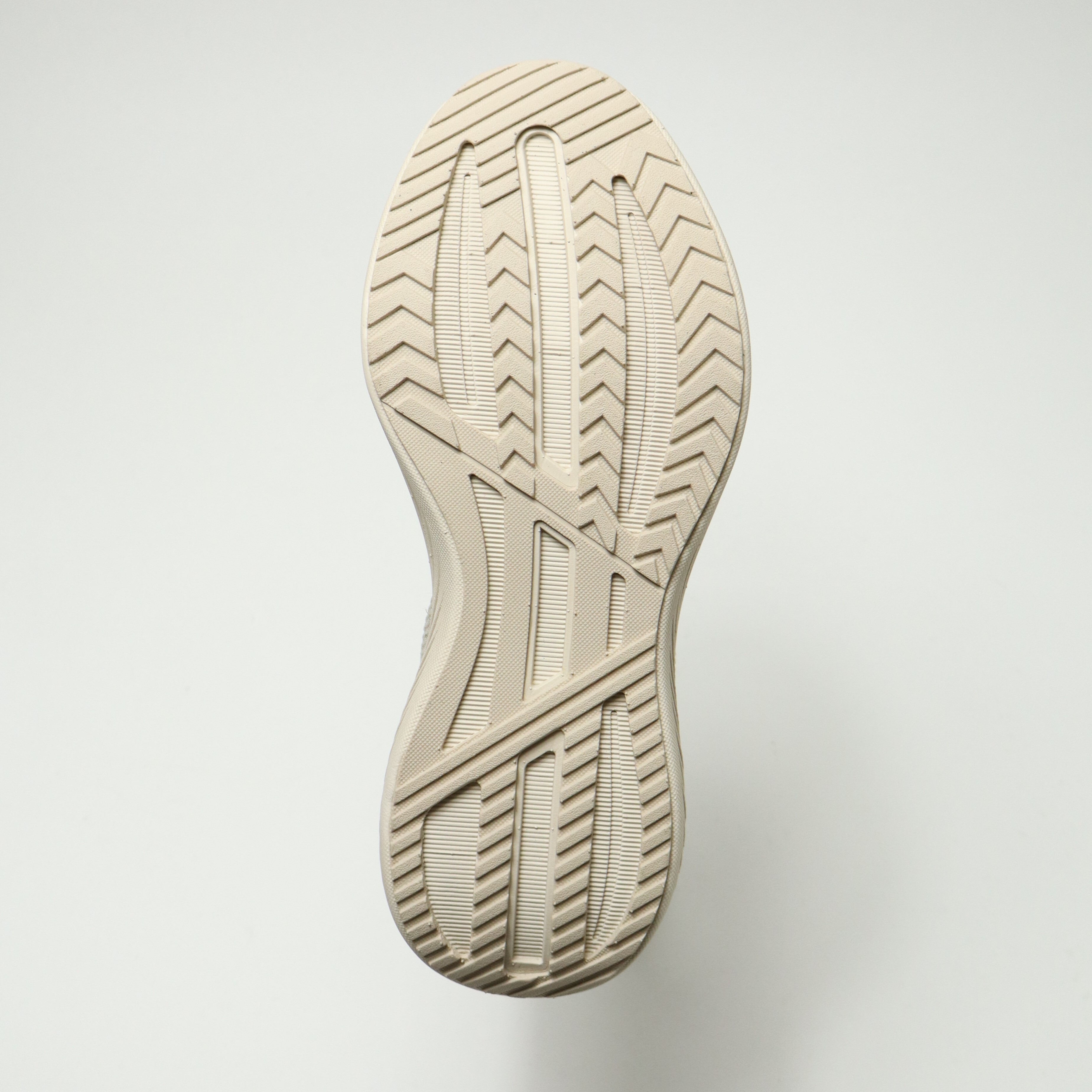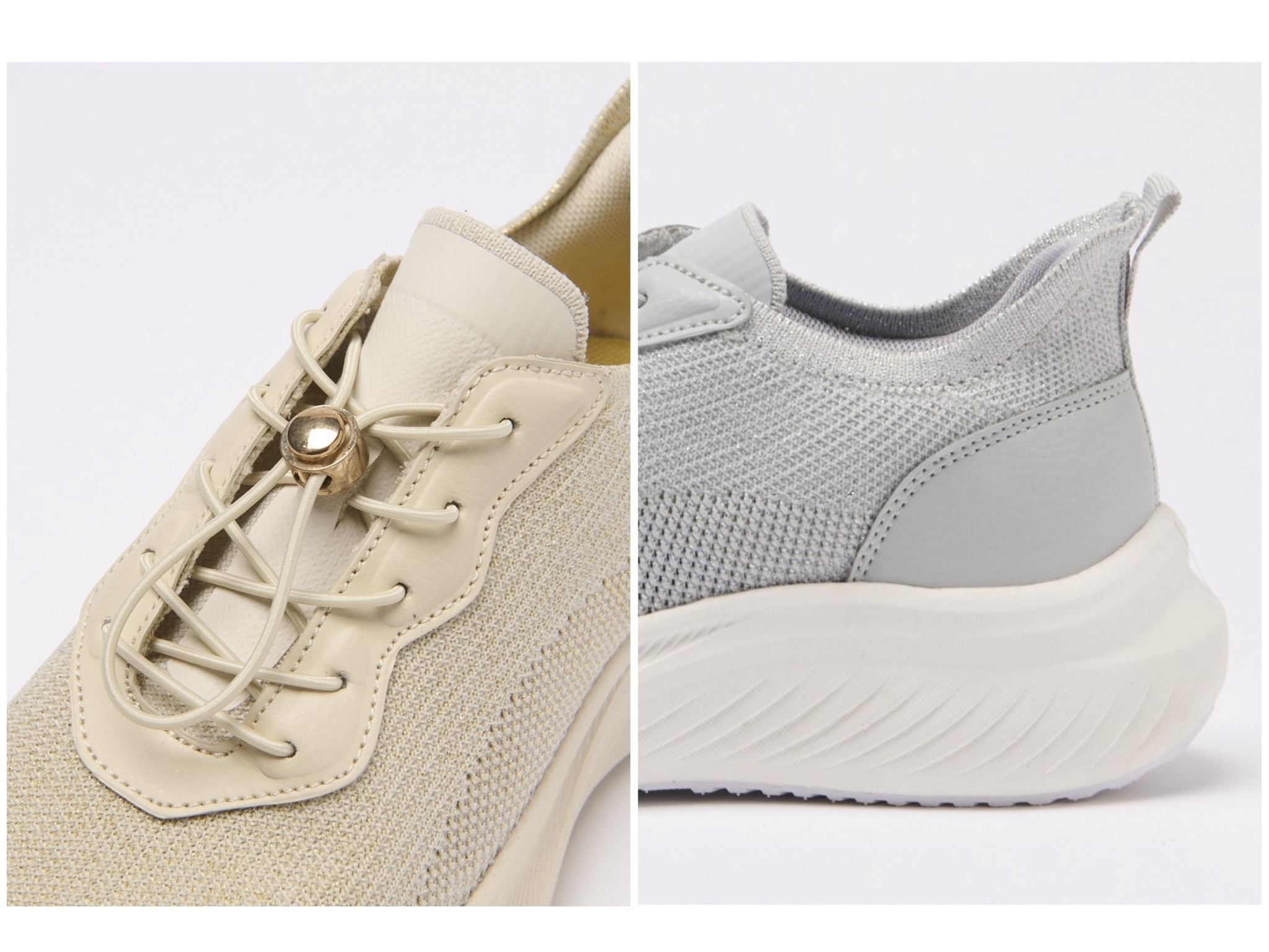 - アッパーには通気性の良いニットを使用。ライトベージュとライトグレーはラメ入りで、エレガントで華やかな印象に。サイドの透かし編みは、より空気を循環しやすく、蒸れによる不快感を軽減。母趾部には縫い目や生地の重なりを付けず、ストレスフリーな仕上がりに。