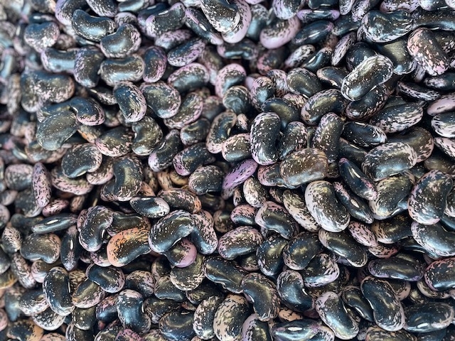 直径3cmほどの大きな豆で、紫と黒のまだら模様が特徴です。日本には江戸時代にオランダから伝わりました。当時は食用ではなく、観賞用の花として広まったといわれています。鮮やかな赤い花をつけることから、「花豆」と呼ばれるようになりました。