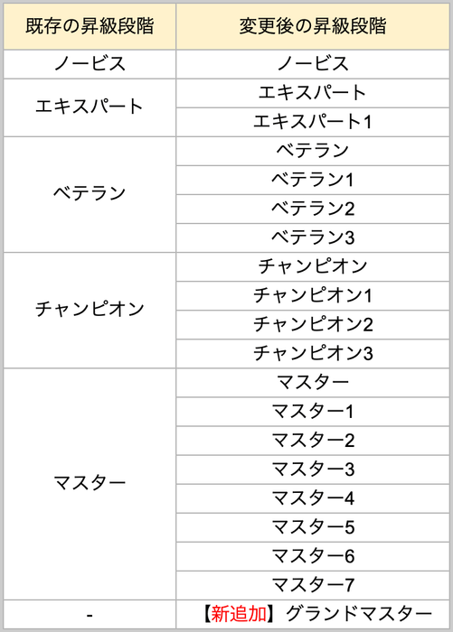既存の昇級段階(ノービス、エキスパート、ベテラン、チャンピオン、マスター)を細分化し、マスターの上に新段階「グランドマスター」を追加しました。
