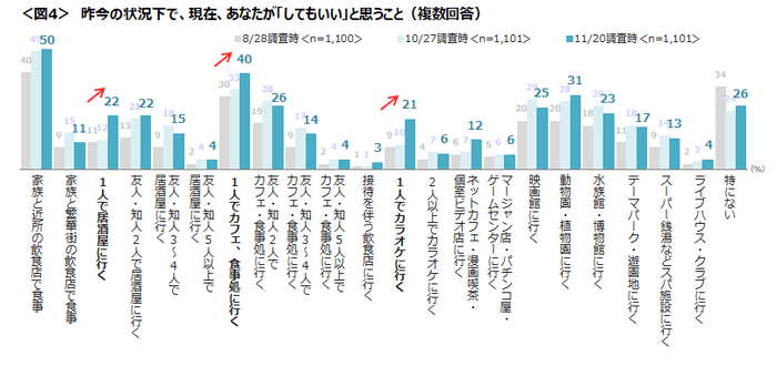 「1人で居酒屋」「1人でカフェ、食事処に行く」「1人でカラオケに行く」が10月末調査と比べて、10ポイント前後増加している。<図4>