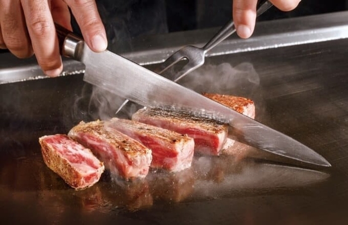 シェフが厳選した国産牛や淡路島産の野菜、新鮮な魚介類などの食材を目の前の鉄板で豪快に焼き上げ、お客様の舌をうならせます。