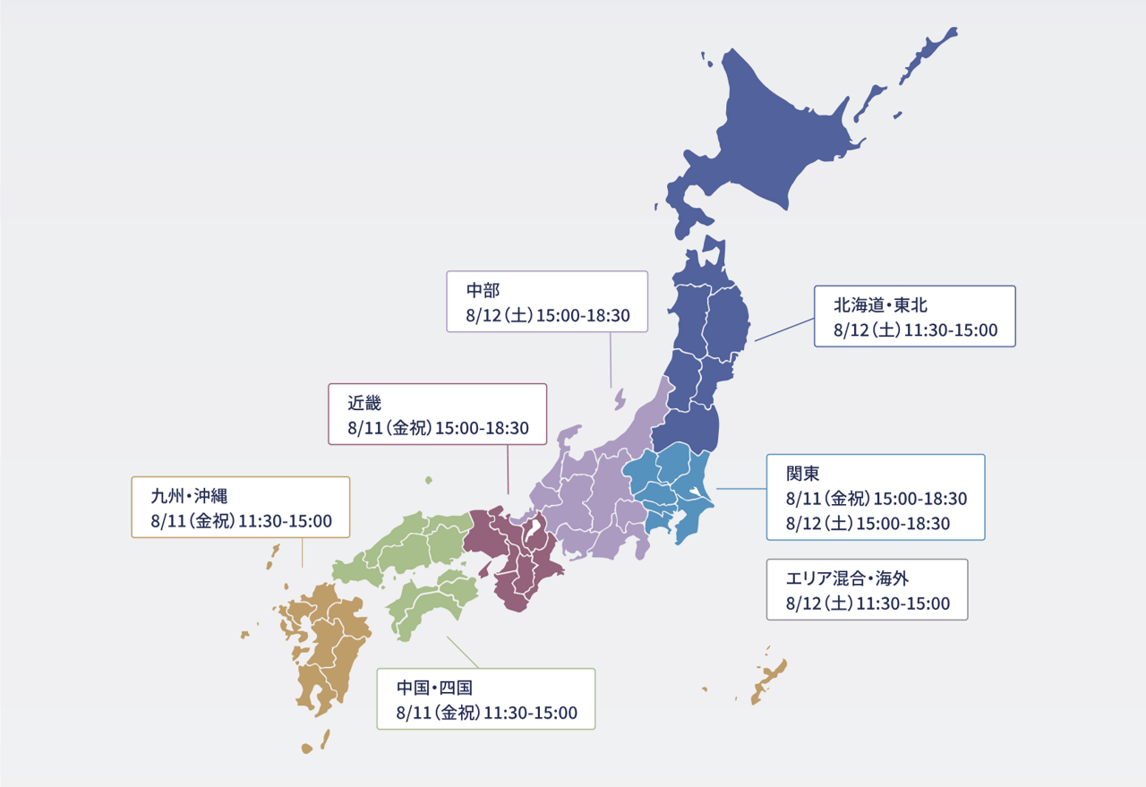 ・関東:8/11(金祝)15:00-18:30、8/12(土)15:00-18:30