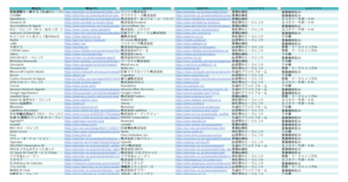 「AIエージェントカオスマップ 2025」作成にあたり、参考にしたサービスURLやAIエージェントサービスの提供会社を記載した一覧表(Excel)は、カオスマップ資料請求後、企業ご担当者様に無償でご案内いたします。ぜひサービスの導入検討や比較にご活用ください。