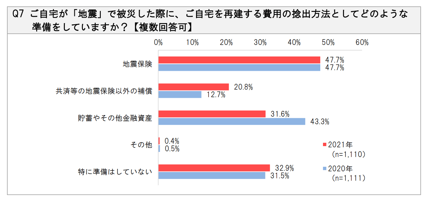 ご自宅が「地震」で被災した際に再建する費用の捻出方法としてどのような準備をしているか聞いたところ、「地震保険(47.7%)」が最も多く、昨年より増加した「共済等の地震保険以外の補償(20.8%)」と合わせると、68.5%が保険・共済等の補償という結果となりました。一方、「貯蓄やその他金融資産(31.6%)」と回答した方は、昨年から11.7ポイント減少しました。