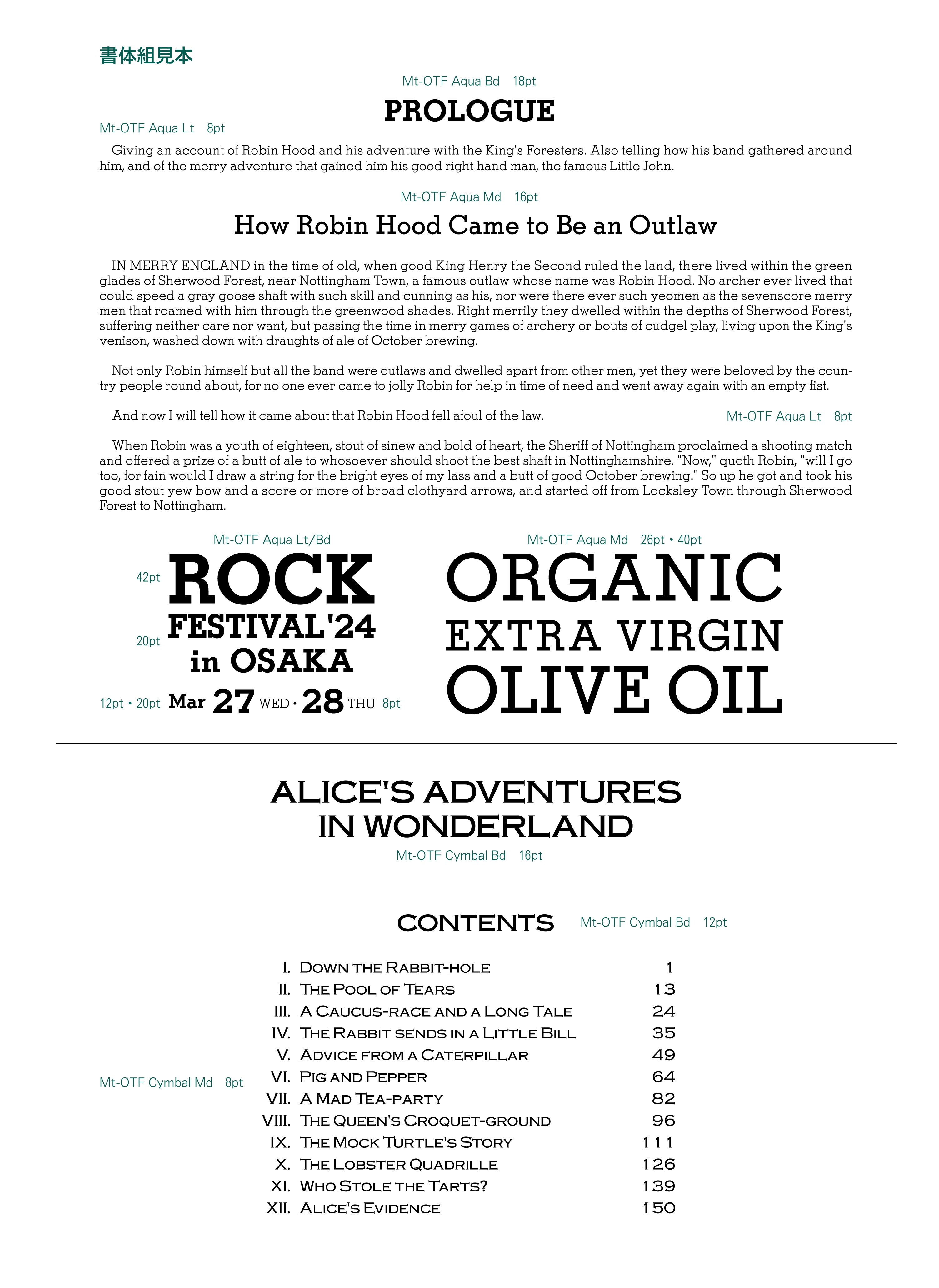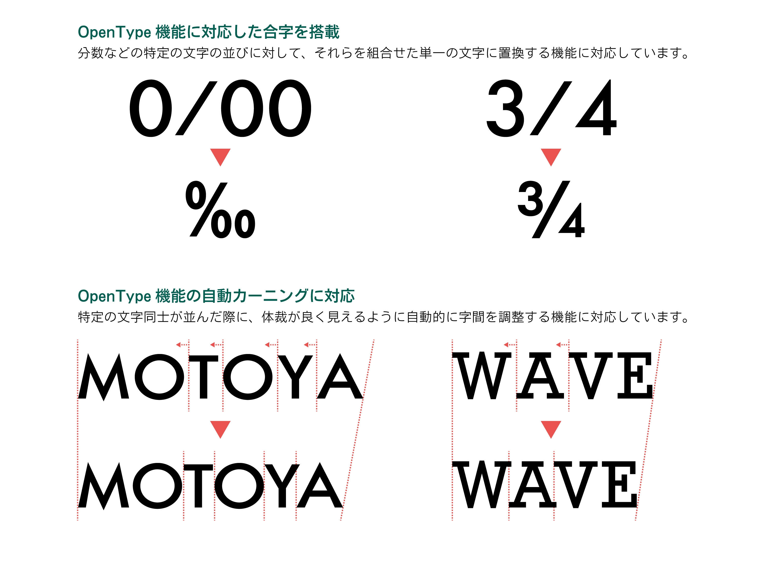 モトヤの欧文書体には、OpenTypeフォント機能が搭載されており、Adobe InDesignやAdobe Illustratorなどの対応アプリケーションで、「合字」や「カーニング」といった機能を使用することができます。