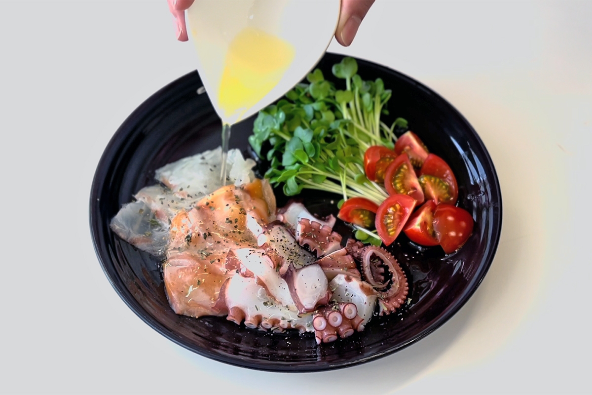 (2)カルパッチョの素とオリーブオイルをかけるだけ!ブラックペッパーやバジルをかけるとさらにおいしく!