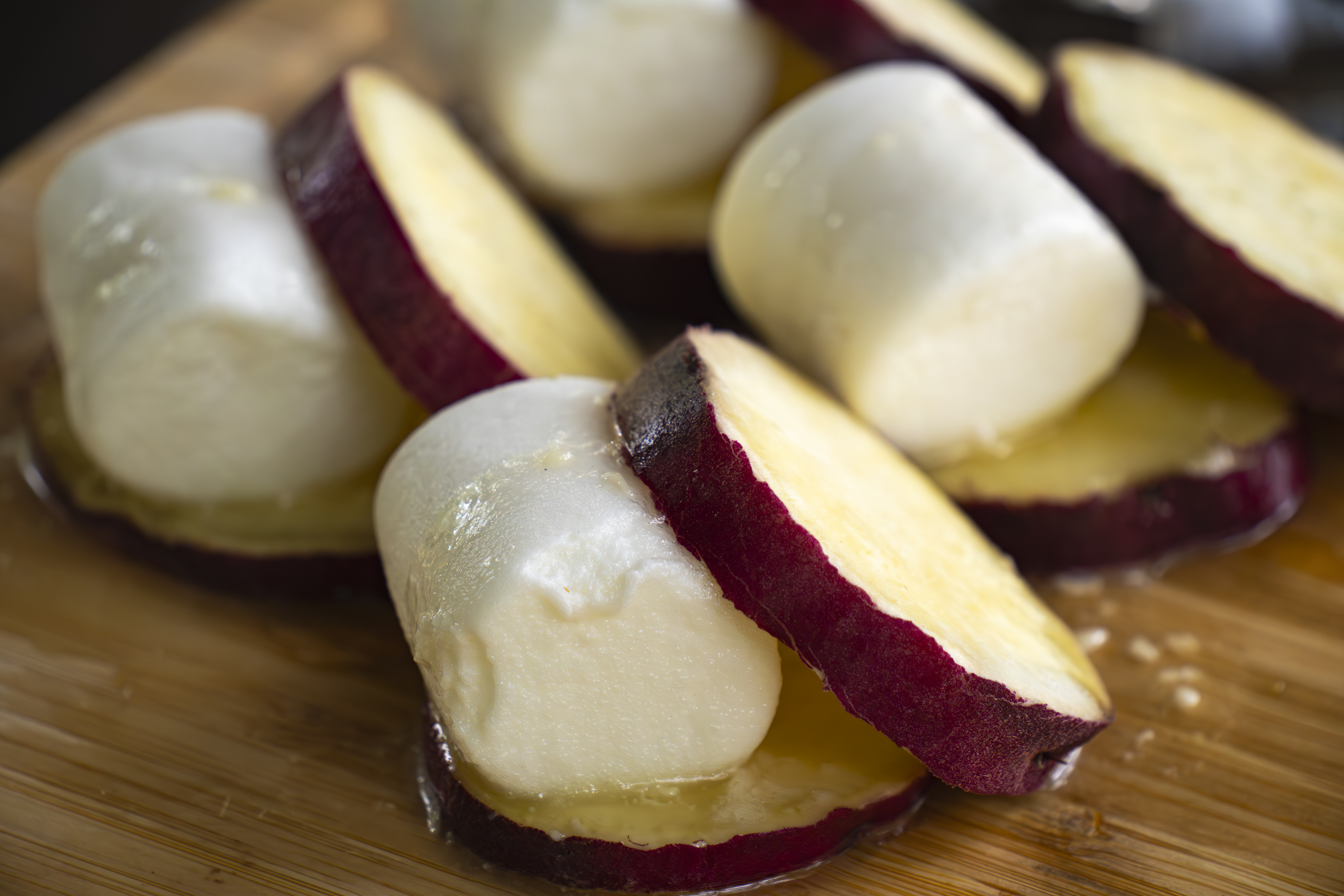 サツマイモを輪切りにしてグリルし、マシュマロとハニーバターソースをサンドした甘いデザート。秋の味覚を締めくくる一品です。