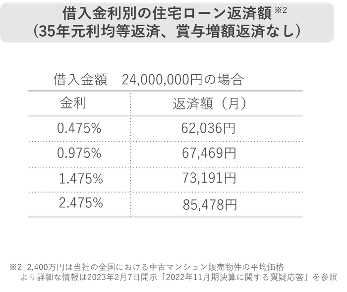 さらに右の表は、将来の金利上昇リスクを示したものですが、仮に金利が2.475%まで上昇しても返済額は約8.5万円です。依然として平均家賃を下回っており、持ち家の支払い優位性が続くことが見て取れます。