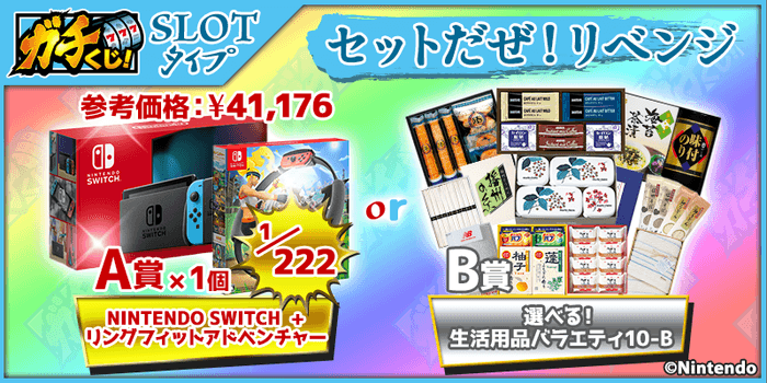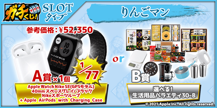まずは第一弾、4月28日(水)20時半からは、A賞に「Apple Watch Nike SE (GPSモデル) 40mm スペースグレイ/オブシディアンミストNikeスポーツループ&AirPods with Charging Case」(確率1/77 ジェム30個コース)及び、A賞に「Nintendo Switch+リングフィット アドベンチャー」(確率1/222 ジェム10個コース)をご用意した豪華なスロットタイプくじを2本、同時販売開始します!B賞には、食品や生活雑貨、アメニティなどを始めとした、『選べる生活雑貨バラエティ』をご用意!様々なラインナップの中から、ご自由にお好きなものをお選び頂けるようになっています。
