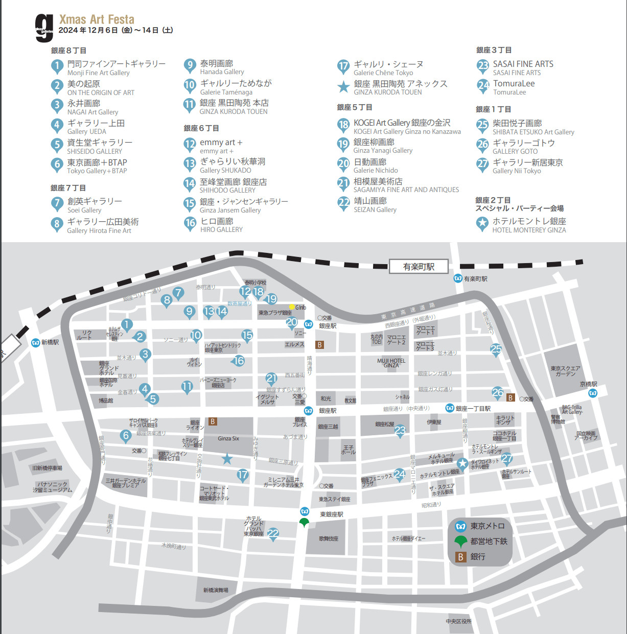 銀座画廊「美の起原」(運営:株式会社セルピエーロ・ダーウィン、本社:東京都中央区、代表取締役:櫻井 淳子)は、12月6日(金)から14日(土)まで開催される、今年で16回目を迎える銀座ギャラリーズ主催の「Xmasアートフェスタ」に参加します。会期中にはXmasアートフェスタ「スペシャル・パーティ」(12月7日(土))とギャラリー巡りツアーも催され、今回参加の全27画廊で、洋服やバッグを選ぶように自分好みのアートをお楽しみいただけます。