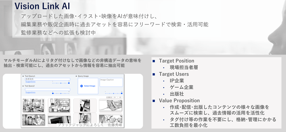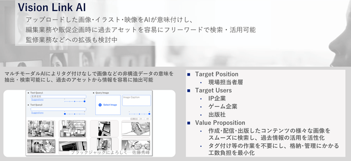 マルチモーダルAI(*1)を活用して、編集・参照業務の効率化を支援するツールです。アップロードした画像・イラスト・映像をAIが意味付けし、フリーワードや類似画像で検索可能にすることで編集業務や販促企画時に過去のアセットを容易に検索・活用できるようになります。これによりタグ付けなしで画像などの非構造データの検索を可能とし、過去のアセットから情報を容易に抽出できるようにすることで、業務工数や負担を最小化します。