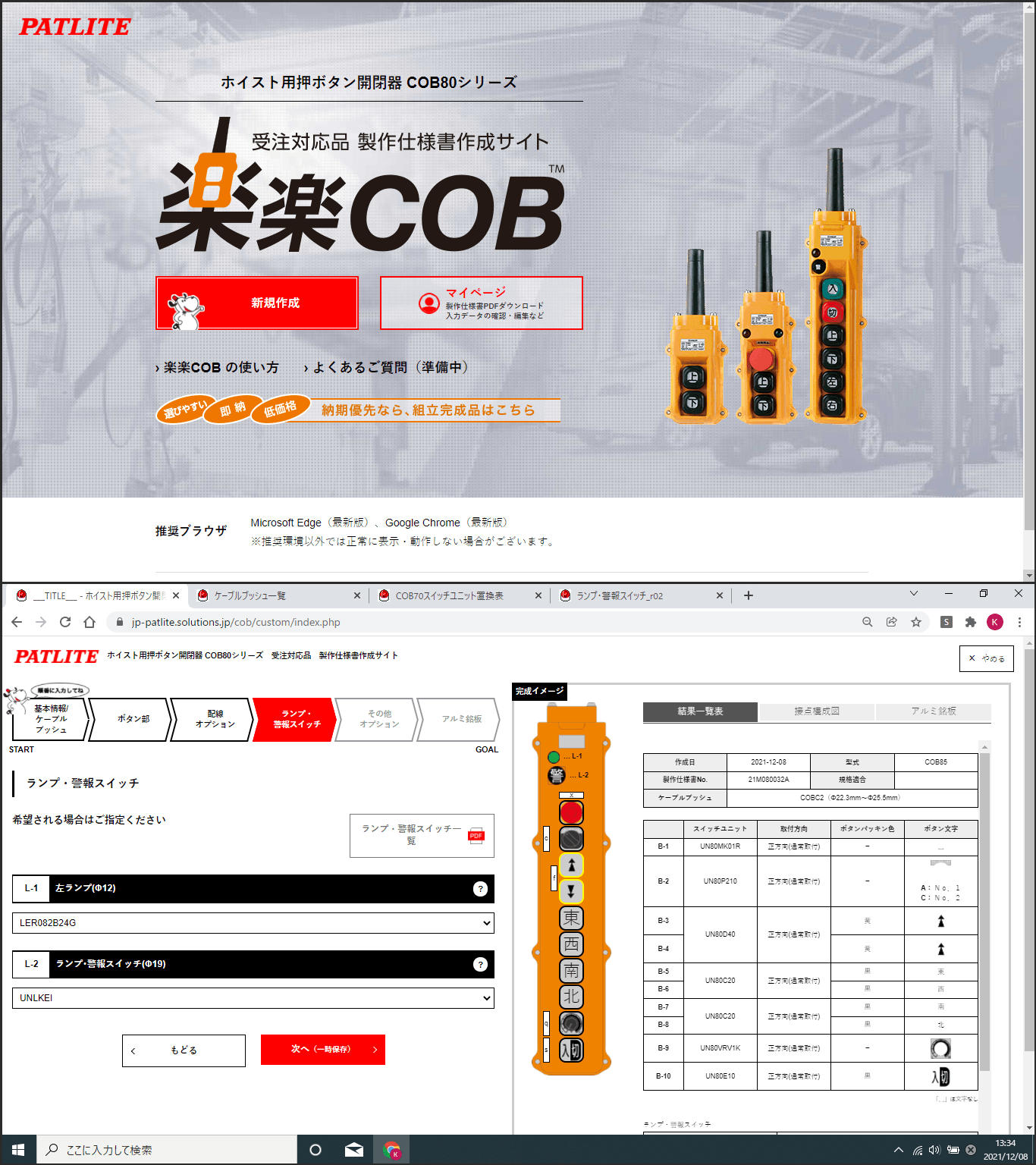 株式会社パトライト(所在地:大阪市中央区、代表取締役社長:高野 尚登)は、ホイスト用押ボタン開閉器 COB80シリーズ 受注対応品の見積や注文に必要な製作仕様書を簡単に作成することができるWEBサイト「楽楽COB」を2022年4月1日(金)に公開します。
