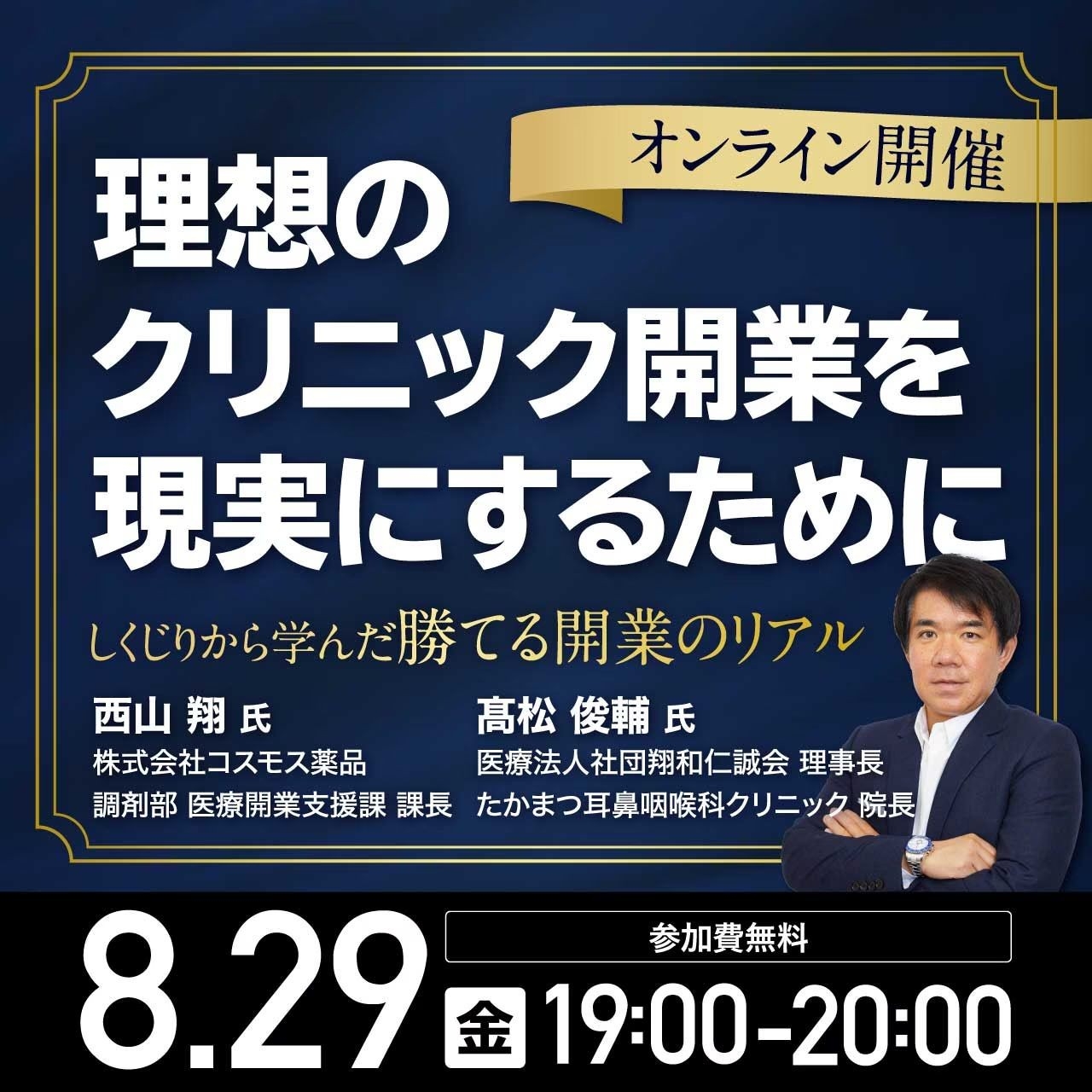医療法人社団翔和仁誠会 理事長 髙松俊輔が、2025年8月29日(金)に開催される、株式会社コスモス薬品主催のオンラインセミナーに登壇いたします。本セミナーは、クリニックの新規開業を検討している医師を対象に、「開業の進め方と成功のポイント」をテーマとして開催されるものです。髙松理事長が、これまでの自身の開業経験や豊富な実例を交えながら、現場目線で“勝てる開業”のリアルについて語ります。
