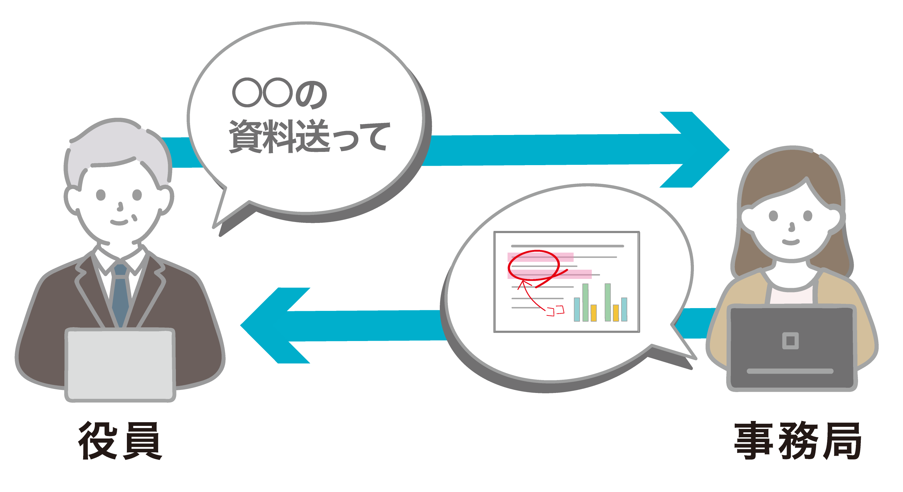 役員と事務局間でメッセージによる指示伝達やメモ書きによる進行サポートなど、リアルタイムな情報連携によるスムーズな総会運営が行えます。