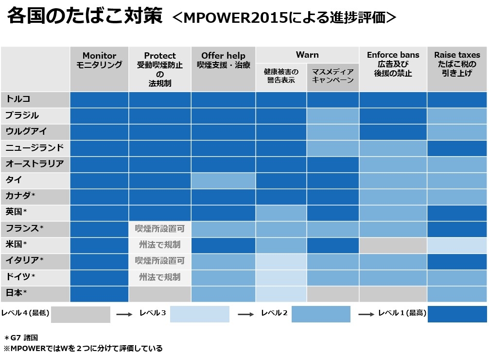 南米の国々も最高レベルのたばこの煙のない環境である中で、日本はその他のレベルの国と地域になっているので、喫煙場所に関して世界で比べるとまだまだ甘い国だといえると思います。