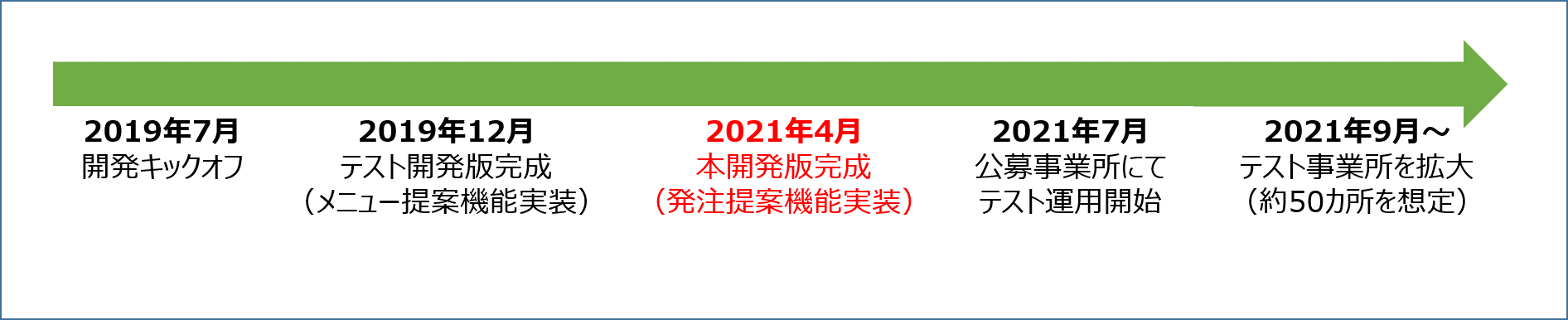 Lappy は 2019 年 12 月に、メニュー提案機能を実装したテスト開発版が完成※5。その後発注提案機能の実装を進め、今回の本開発版完成に至りました。今後 2021 年 7 月より、当社の食材流通子会社である株式会社レオックフーズをご利用の一部事業所からテスト運用を開始。その後改良を経て、年度内の全国展開を目指しております。