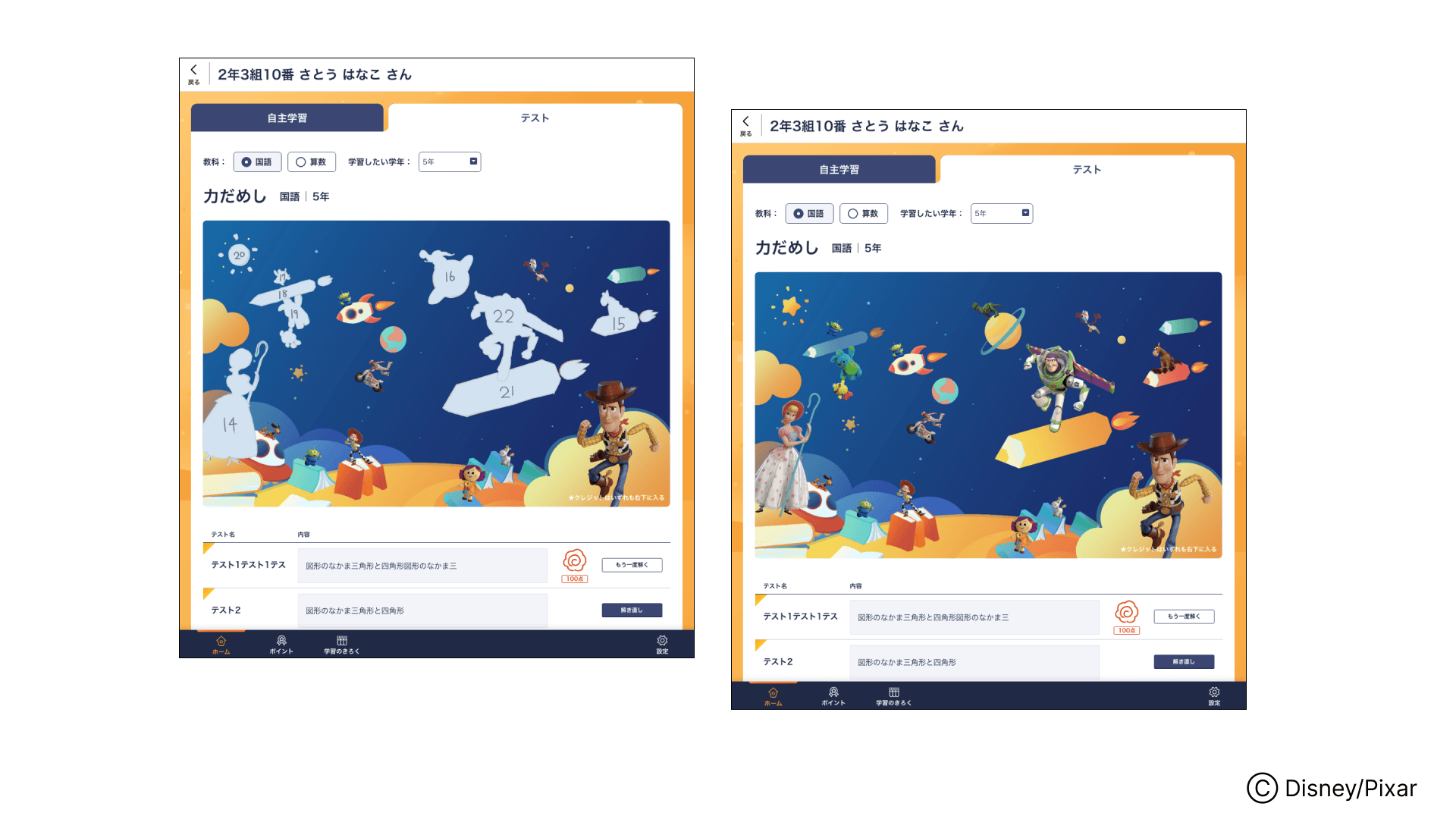 テストで100点をとると、当社のくりかえし漢字ドリル・計算ドリルでもお馴染みの「ピクサー」のキャラクターを獲得でき、取り組みによって絵が完成していきます。