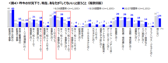昨今の状況下で、現在、あなたが「してもいい」と思うことを聴取したところ、2人または3~4人で「居酒屋に行く」、「カフェ・食事処に行く」が6月・8月に比べて増加。5人以上の飲食は未だ低いが、少人数での外食は「してもいい」と回答。Go To Eatキャンペーンの影響もあるのではないかと推察される。<図4>