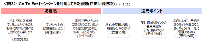 キャンペーンの利用者に、利用してみた感想を聴取したところ、お得感と還元ポイントに関する回答が散見された。還元ポイントについては、付与に時間がかかることや、ポイントが利用できるお店の少なさ、制度の分かりづらさの回答があがった。 <図3>