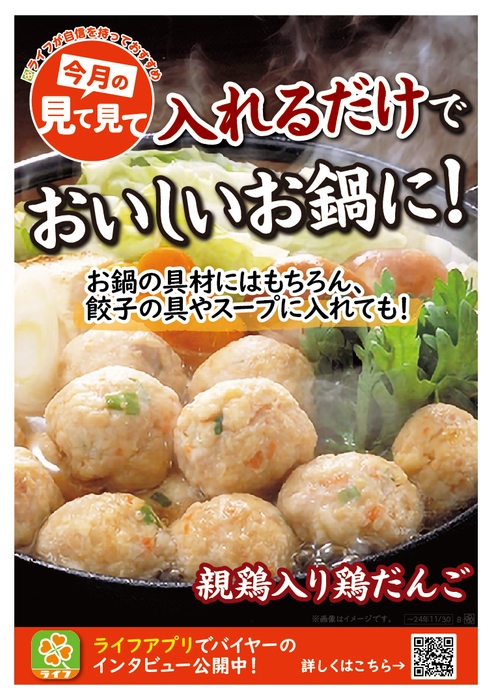 ご家庭で手軽に本格的な鍋料理が楽しめる「親鶏入り鶏だんご」は、首都圏ライフの138店舗にて販売しております。