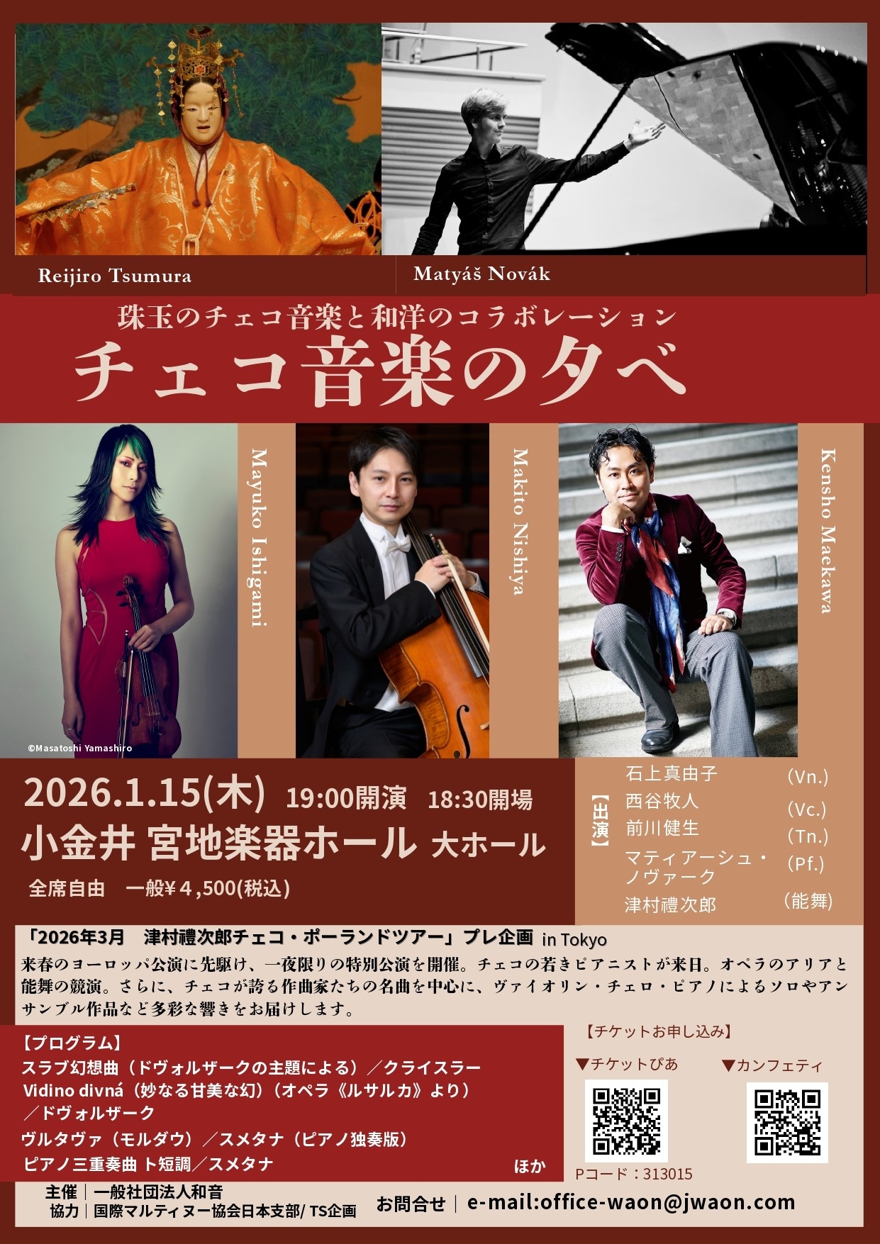 一般社団法人和音主催、津村禮次郎 チェコ・ポーランドツアー プレ企画【Vol.2】『チェコ音楽の夕べ』が2026年1月15日(木)に小金井 宮地楽器ホール(大ホール)(東京都小金井市本町6-14-45)にて上演されます。