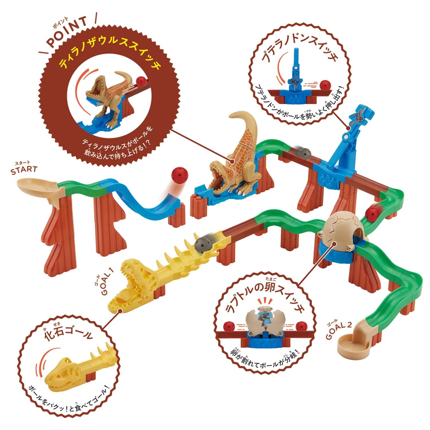 ダイナミックな動きの恐竜型スイッチとブロックを組み合わせて無数のコースを組むことができます。