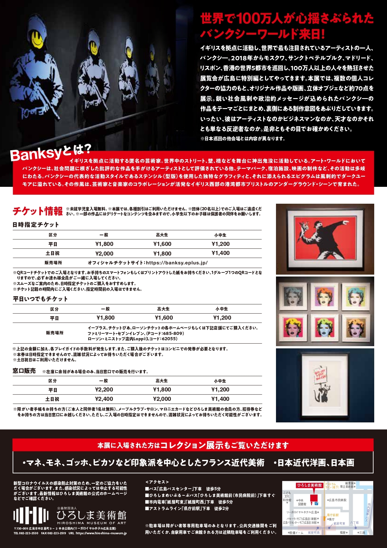 株式会社広島ホームテレビ(所在地:広島県広島市、代表取締役社長:三吉 吉三)と、公益財団法人ひろしま美術館(所在地:広島県広島市、 館長・理事長:池田 晃治)は、主催で2021年11月6日(土)~2021年12月5日(日) の期間、「バンクシ―展 天才か反逆者か 広島エディション」を限定1ヵ月 特別に開催いたします。